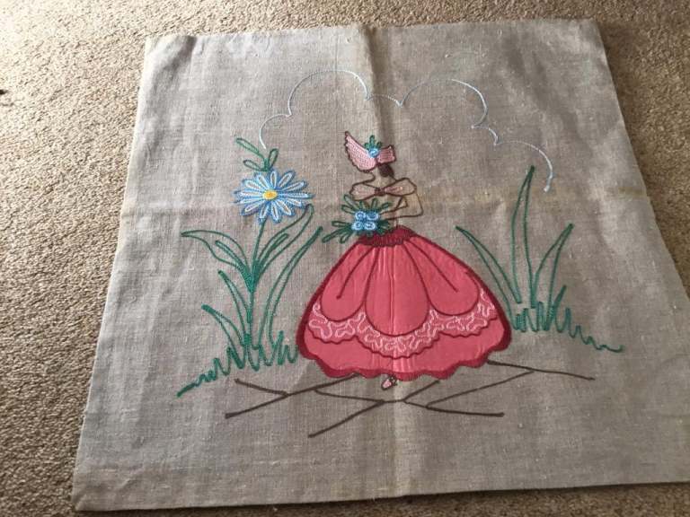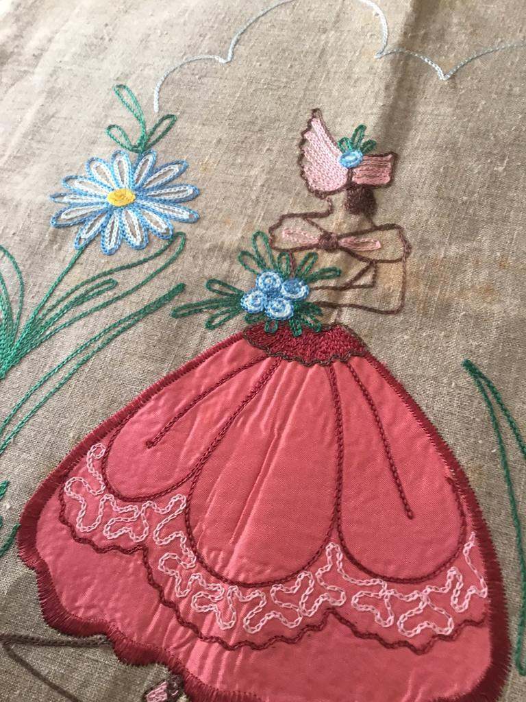 1930/40’s LINEN UNFINISHED CUSHION COVER, (CRINOLINE LADY) EMBROIDERY & APPLIQUÉ WORK, BEAUTIFULLY STITCHED, 19 inches square