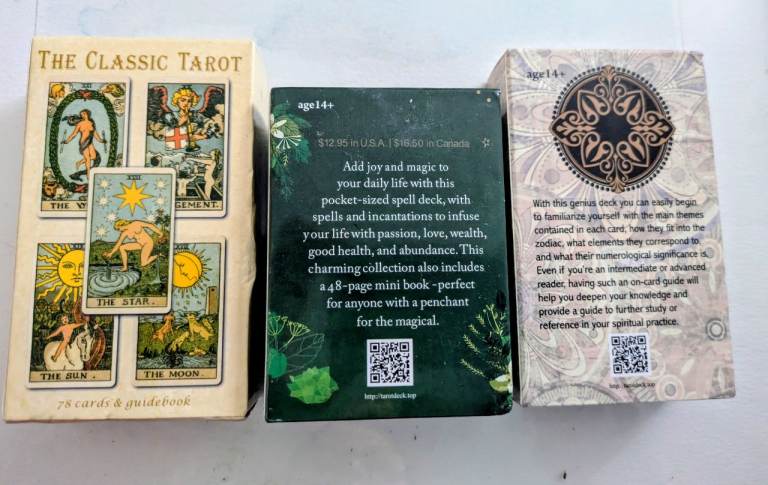 Two sets of Tarot cards and one set of practical witch's spell cards. Unused, as good as new condition. In Dungannon. £10 for all 3 sets.