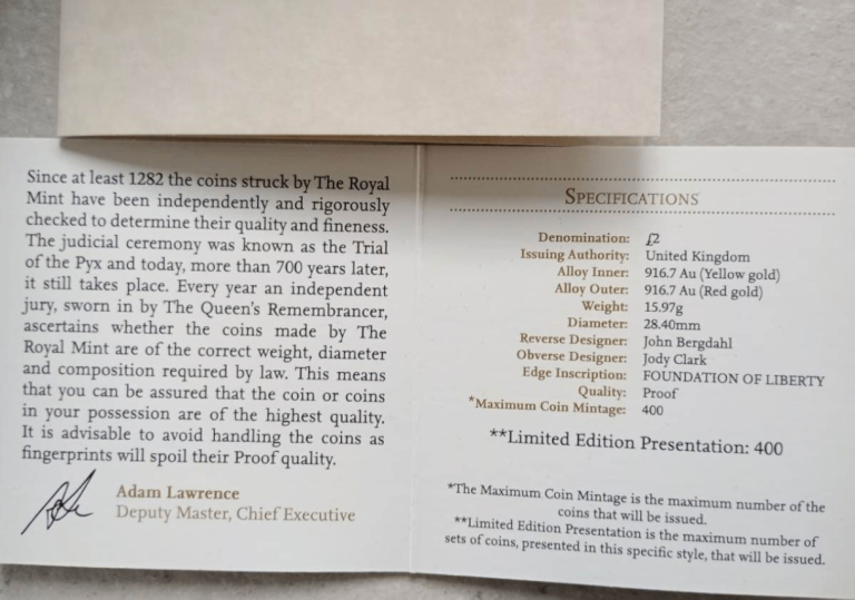 The £2 gold coin - sometimes referred to as the Double Sovereign (twice the weight of a Gold Sovereign). The coin comes with both a Royal Mint box and the certificate of authenticity.