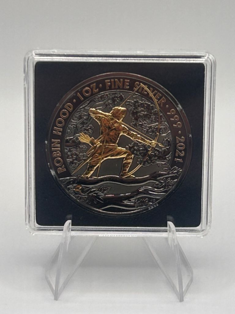 2021 Robin Hood 1oz Fine Silver Coin featuring stunning ruthenium black finish with selective yellow gold plating.