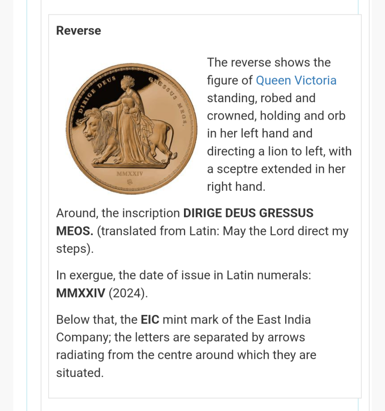 The obverse of the original showed the young portrait of Queen Victoria, also by Royal Mint engraver William Wyon (1795 - 1851). The reverse draws its theme from Edmund Spenser’s epic poem entitled the Faerie Queene, first published in 1590 during the reign of Queen Elizabeth I, and depicts the Queen as Una guiding the British lion. There is a powerful contrast between the restrained energy conveyed by the lion and the peace and grace of the standing figure of Una. The design is an unusual one for a British coin, being too medallic - but then, it was never intended for circulation.