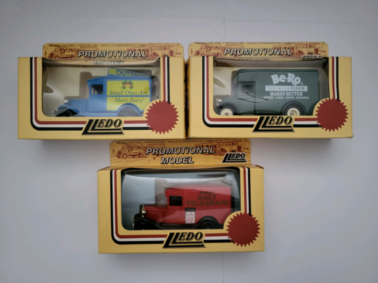 3 boxed Lledo Model Vans consisting of 'Outspan', 'Be-Ro Self Raisinv Flour' and 'Derby Evening Telegraph'. All in good condition. Free collection Derby area or can post for additional postage fee of £3.35.