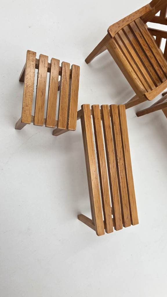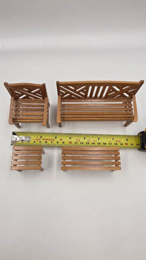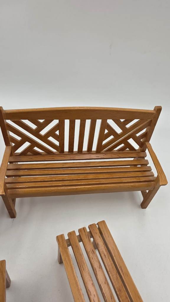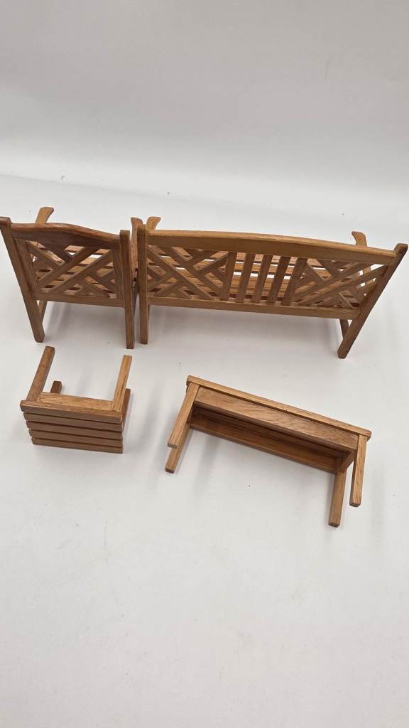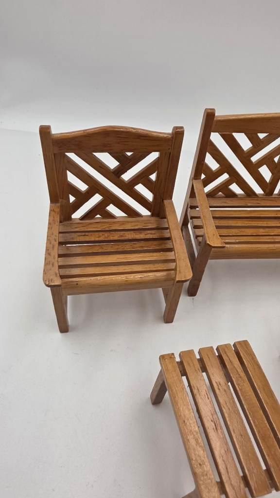 This 4-piece dollhouse miniature outdoor garden furniture kit includes a stool, table, and chair in a plain colour. Made of wood with a cottage style, this 1:12 scale set is perfect for outdoor rooms and themed settings like princesses, fairies, and celebrities, this kit is suitable for ages 12 and above and originates from China. Ideal for those interested in fun, curiosity, hobbies, and crafts, this furniture set adds a touch of romantic and fairy tale elements to dollhouse displays.