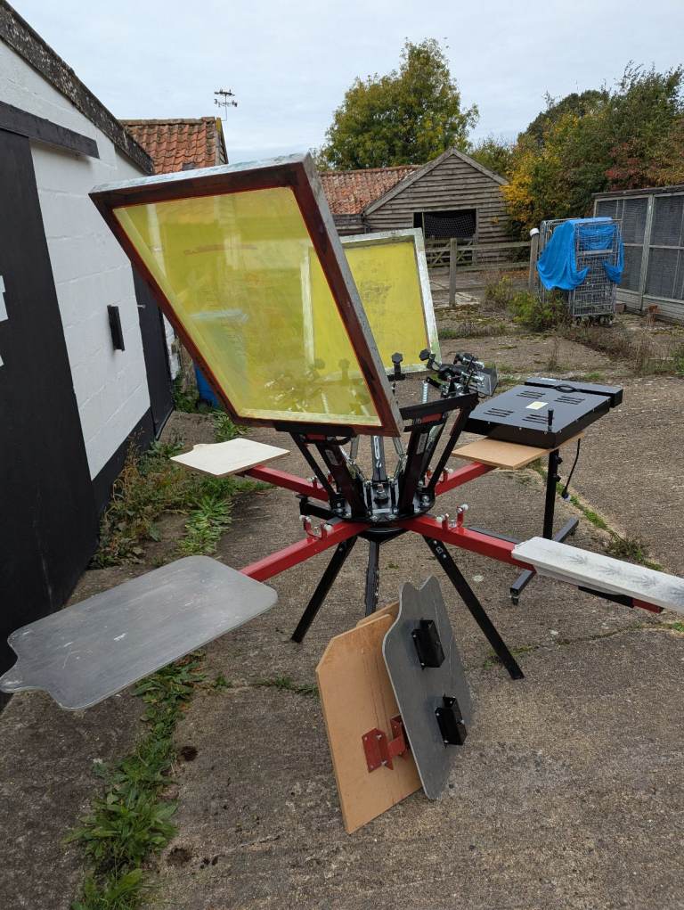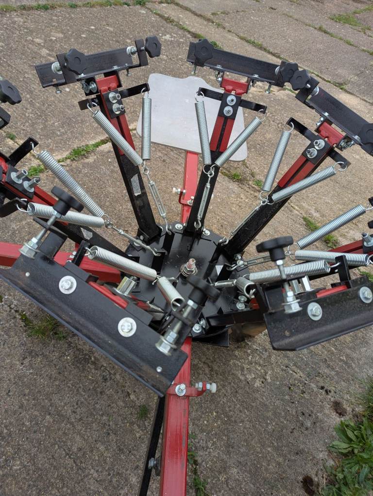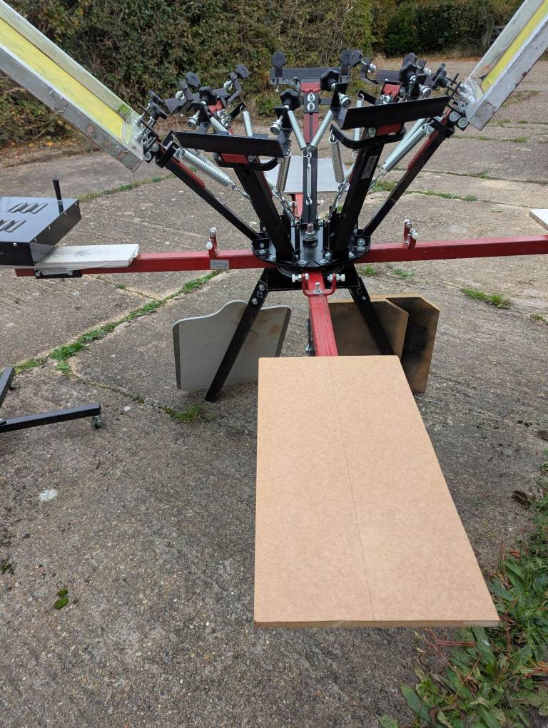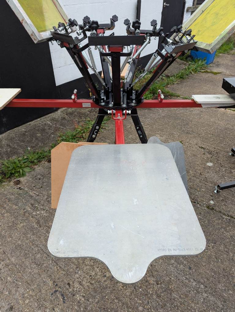 8 Colour 4 stations Manual Press. I have used this press for a few years but have now upgraded. I'm advertising it as a hobby press as it's not built for industrial use (saying that I have run large jobs on it). One of the awesome things about this press is the versatility as you can make any type of pallet desired. Sleeve printing, inside neck, large prints etc can be achieved easily.