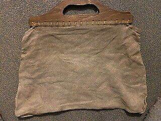 A linen knitting bag which has the remainder of hand embroidered flowers in wool and could be reworked- with lovely smooth wooden handles--probably 1930s vintage---cloth part measures 17x11ins