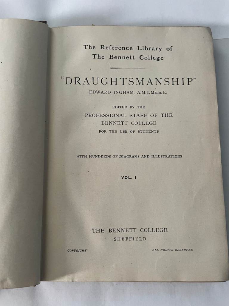 A book from the reference library of the Bennett College, Sheffield, probably dating back to the1960's. Volume 1 on the subject of draughtsmanship.