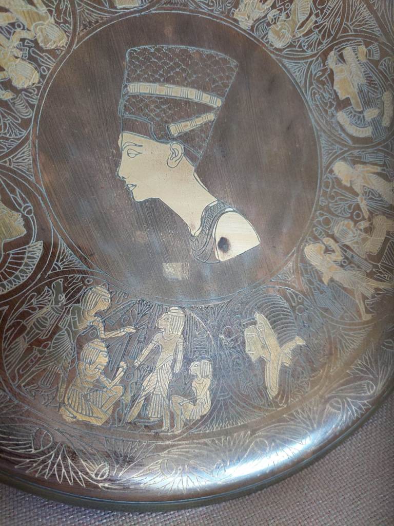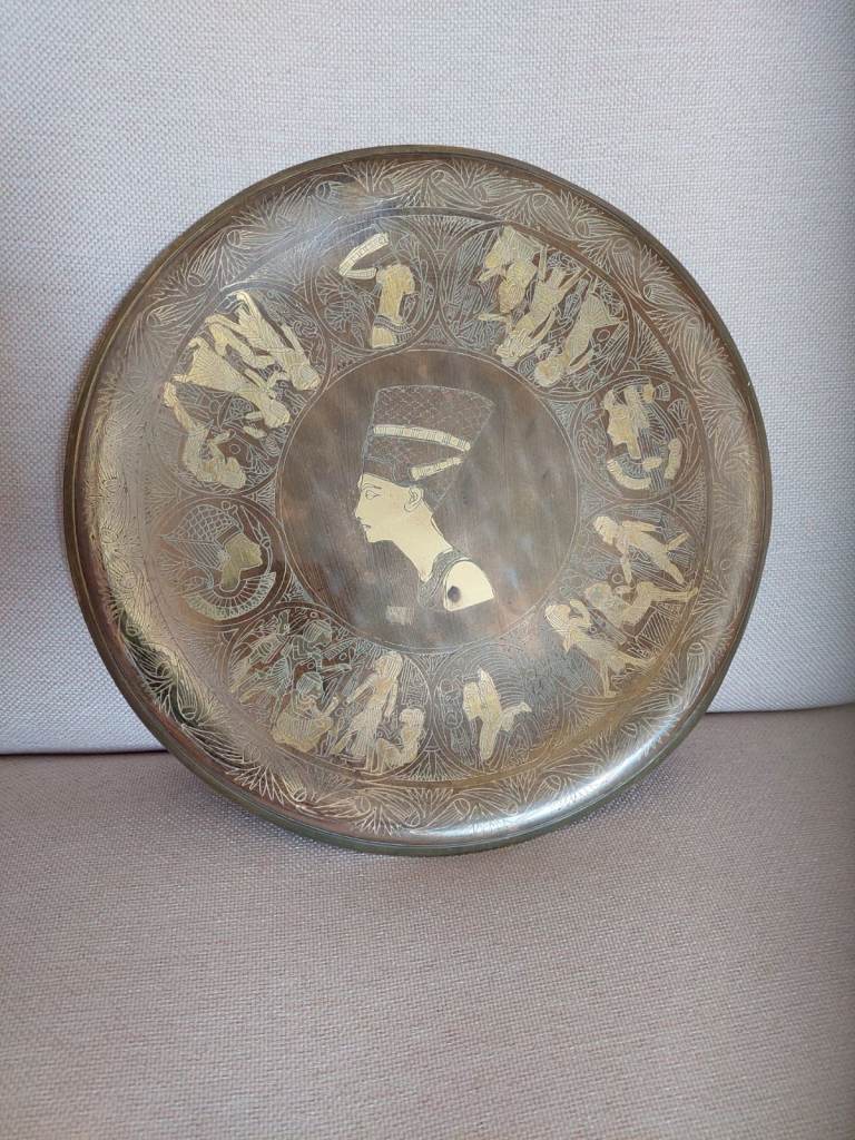 Metal display plate featuring Queen Nefertiti as the central element with other Ancient Egyptian scenes around it in gold/brass and copper finish. Width approx 9.5 inches/ 24 cm.