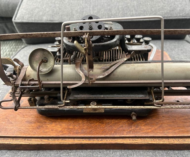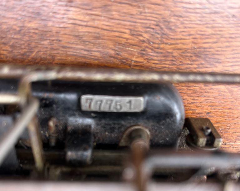 The Blickensderfer was advertised as having one quarter of the parts that other typewriters used, allowing for easier operation, maintenance, and repair. Other features include a tabulator and a scaled with slots for carriage stops. Blickensderfer typewriters also had a patented type action using their patented “type wheel,” a metal wheel containing all the characters which would rotate and strike the paper to create the inked mark. The type wheel allowed for easier type alignment, less jamming, and an easier way to change type fonts. The simplicity of the Blickensderfer made it portable, and this model had a wooden cover with a leather handle for easy carrying. While QWERTY keyboards could be ordered, by default most Blickensderfer typewriters eschewed the QWERTY keyboard in favor of a “Scientific” keyboard that put the most used letters “D, H, I, A, T, E, N, S, O, and R” on the bottom row nearest the space bar to minimize hand movement.