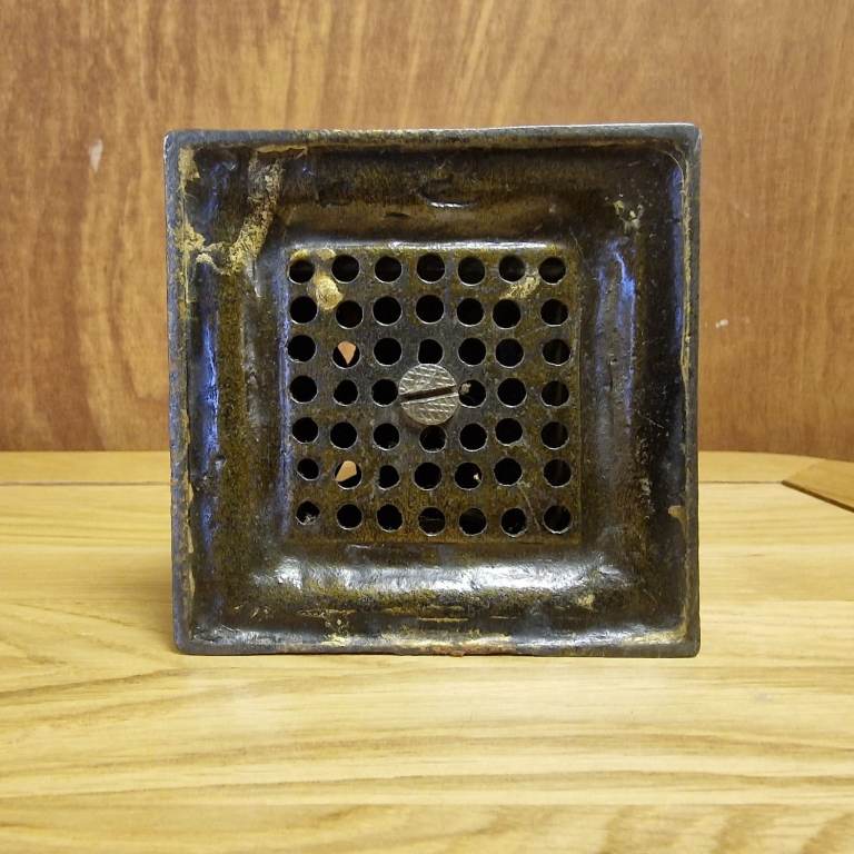 It is made from cast iron metal. Please see photographs provided for more details and visual confirmation of condition. Normal signs of age and use wear. 24 cm Height