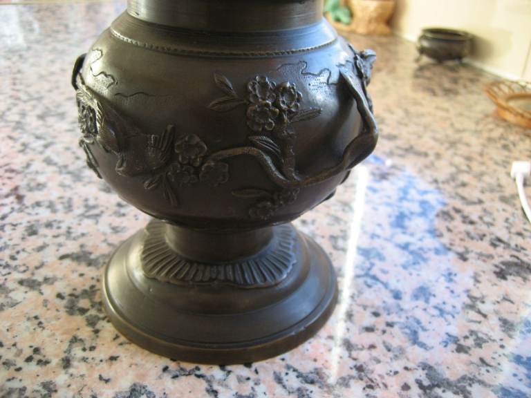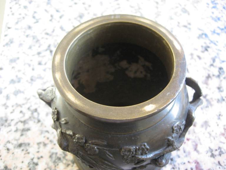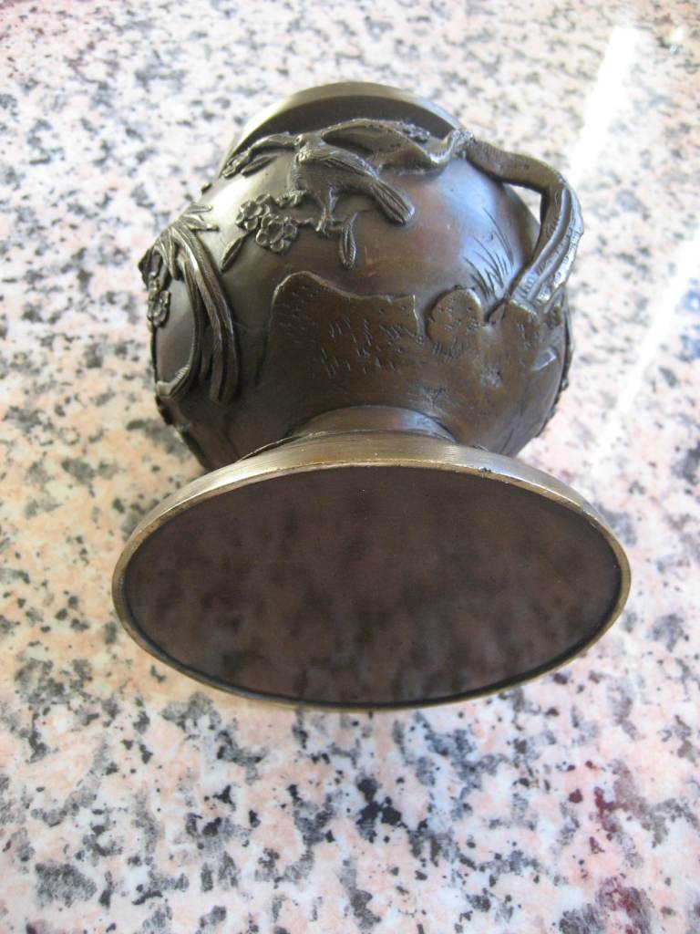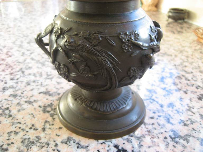 The bronze incense burner has highly decorated relief in the form of two phoenix birds, along with a smaller bird of prey, tree branches with leaves and ground vegetation, along with clouds and is STUNNING in detail. The lid has a decorated Foo Dog finial with good detail and looks like it has been hand created/finished unlike others that are moulded (see photos).