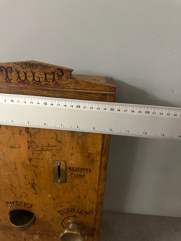 Believed to be dating to around 1900–1915, this is a genuine early penny-in-the-slot amusement machine, originally used in pubs, clubs and early arcades to dispense tokens (“checks”) for games and entertainment.