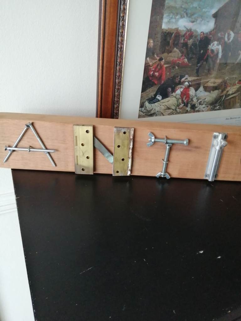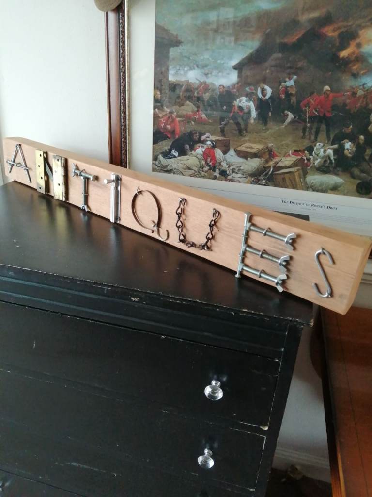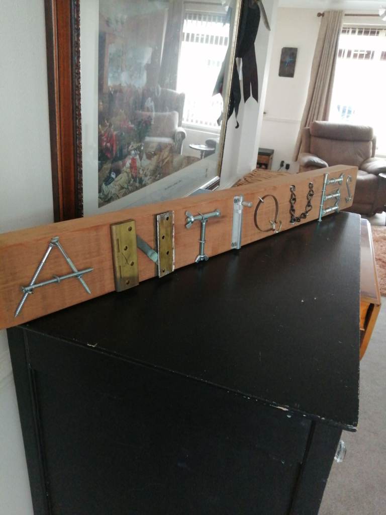 Here we have a ;Antiques sign made from reclaimed timber and old ironmongery parts. Sizes are height 11cm length 94cm and depth is 5cm. Can be free standing or screwed to the wall. Check out my other listing's Thank you.