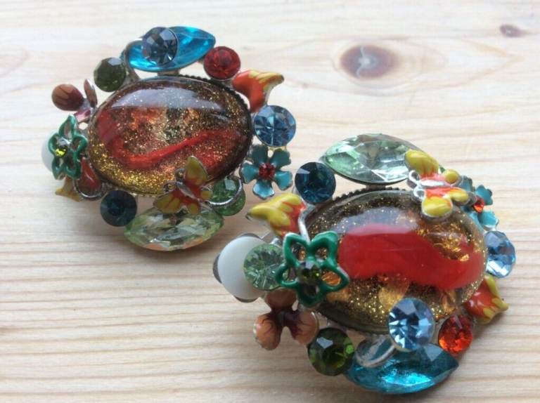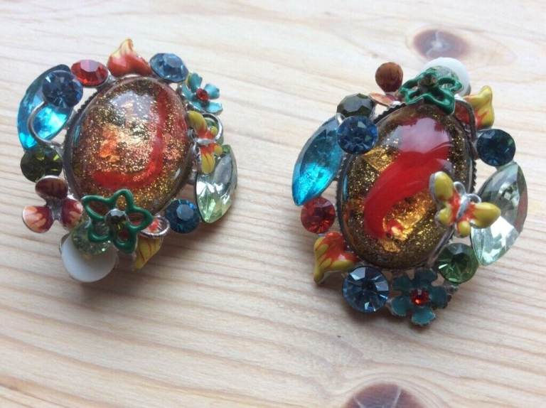 I bought these about 10 years ago for more rom a fabulous bric-a brac market stall and could not resist them. Dims: 4 cm long and 3 cm wide; Wildly, over the top costume jewellery featuring enamelled flowers and butterflies, gold glitter encased in lucite or resin, colourful cut glass and plastic gems all mashed up together to create this unique look.