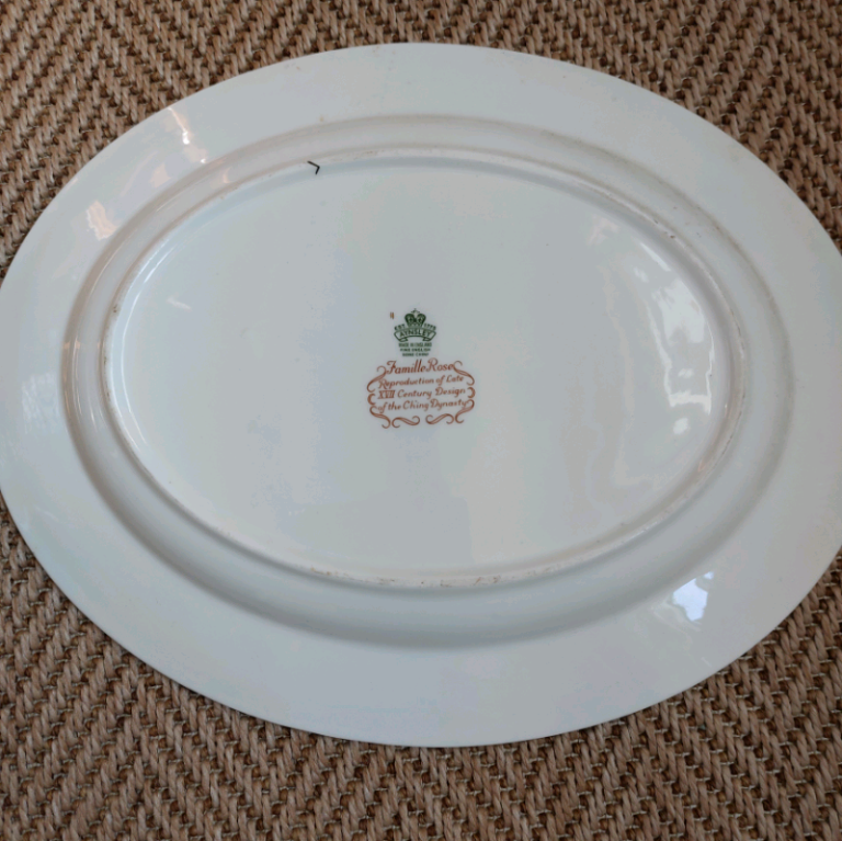 Aynsley bone China oval platter, the pattern is called Famille Rose, it is a reproduction of the late XVII century of the Ching Dynasty. Width 35cm, depth 28cm, excellent condition.
