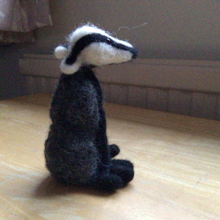 Handmade badger , in grey, black and white made with merino wool. Stands 4.5 inches tall