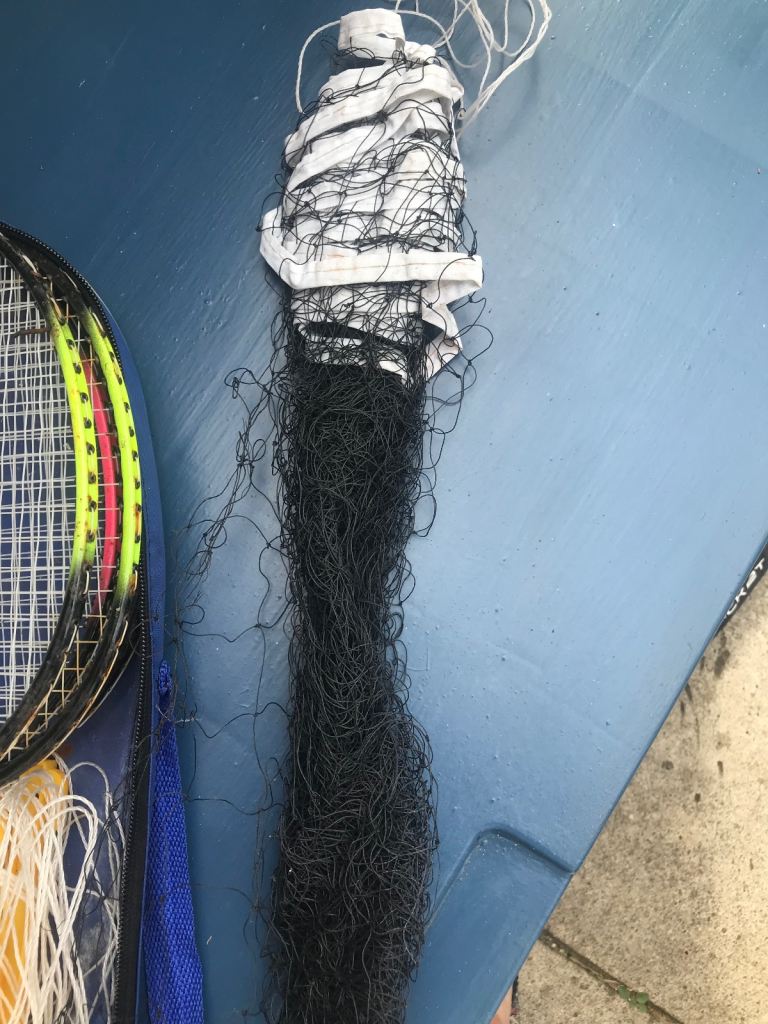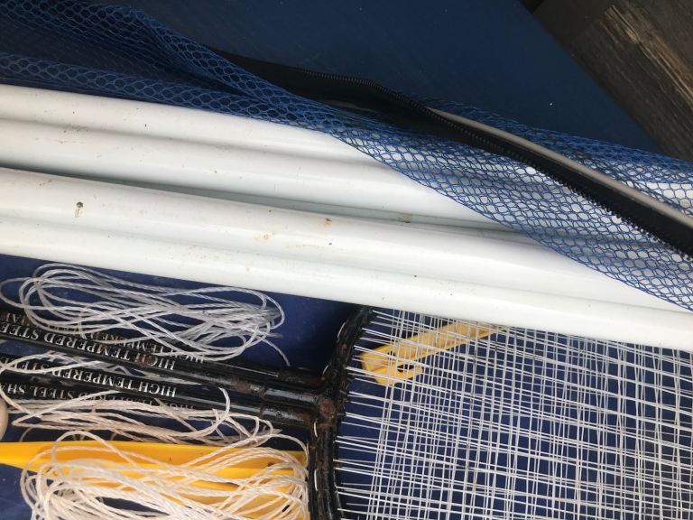 This set has 4 rackets and polls & a net so you can use it on the go on the beach in a field .