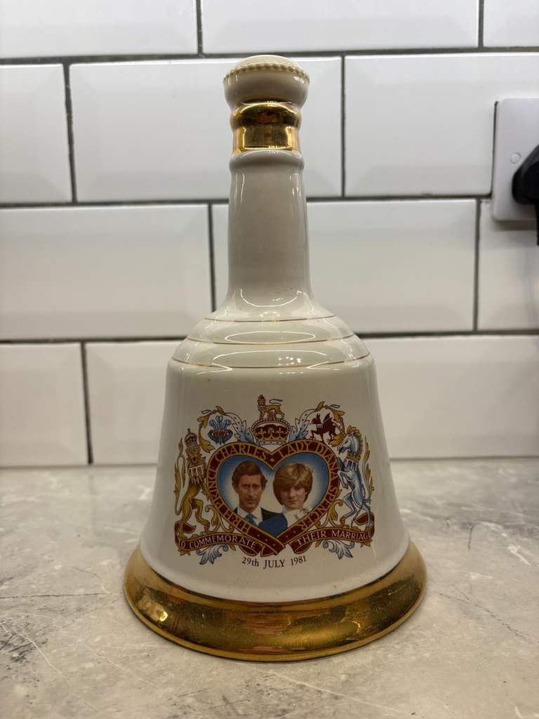 Vintage Bell’s Scotch Whisky commemorative porcelain decanter celebrating the wedding of Prince Charles and Lady Diana Spencer (29th July 1981).