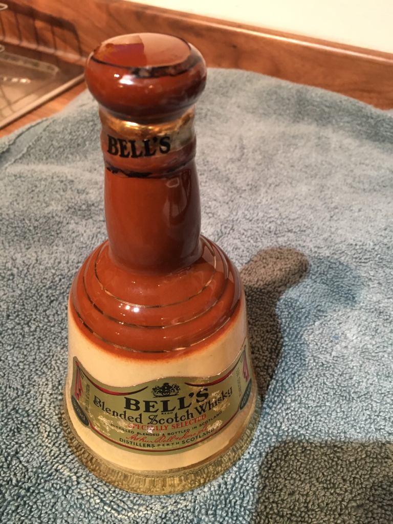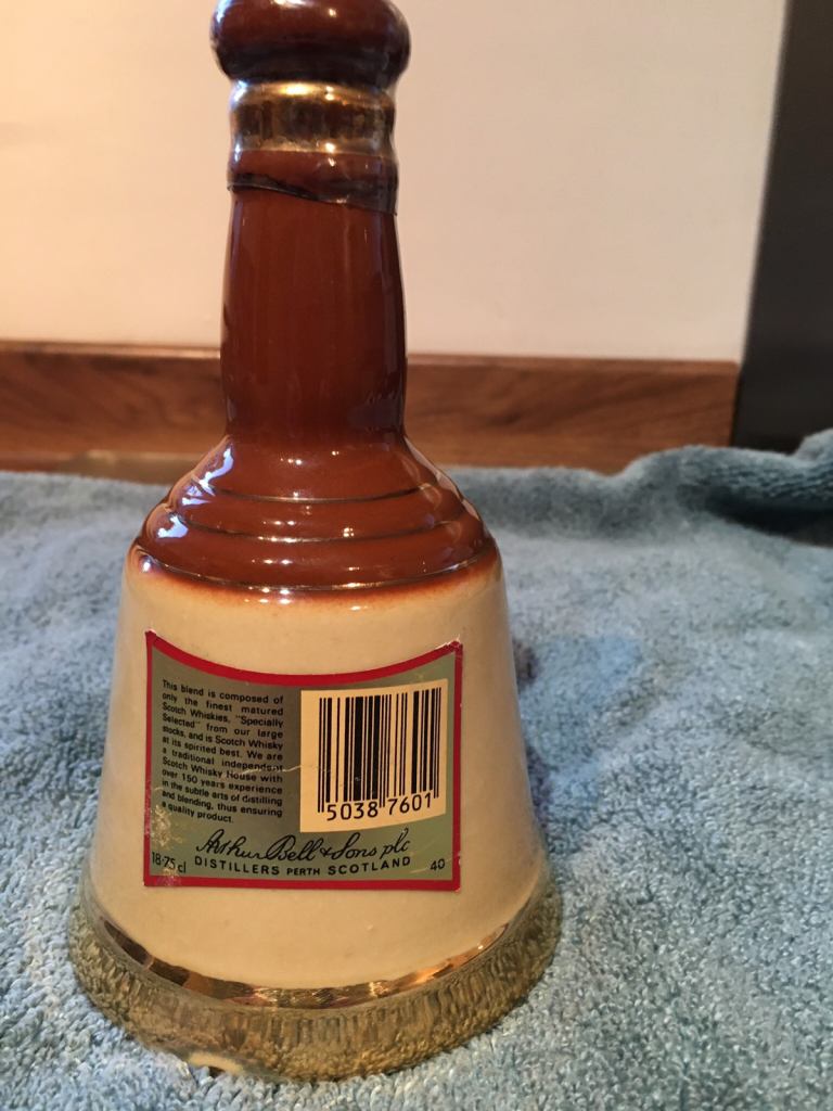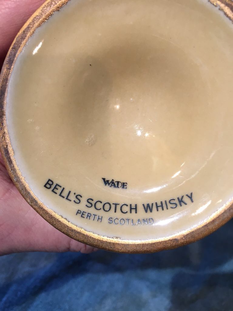 Bells Wade Vintage Porcelain bottle. 18.75cl in the shape of a bell. Genuine Wade Porcelain in good condition. Slight wear and tear. Collection only Undy, Magor.
