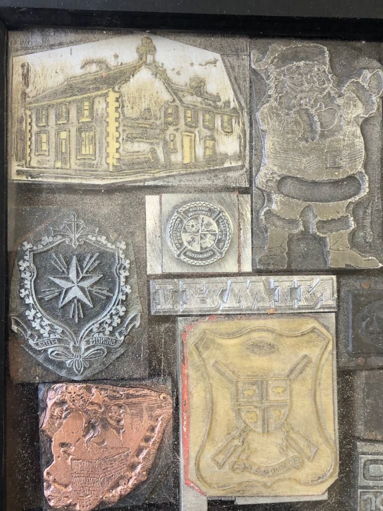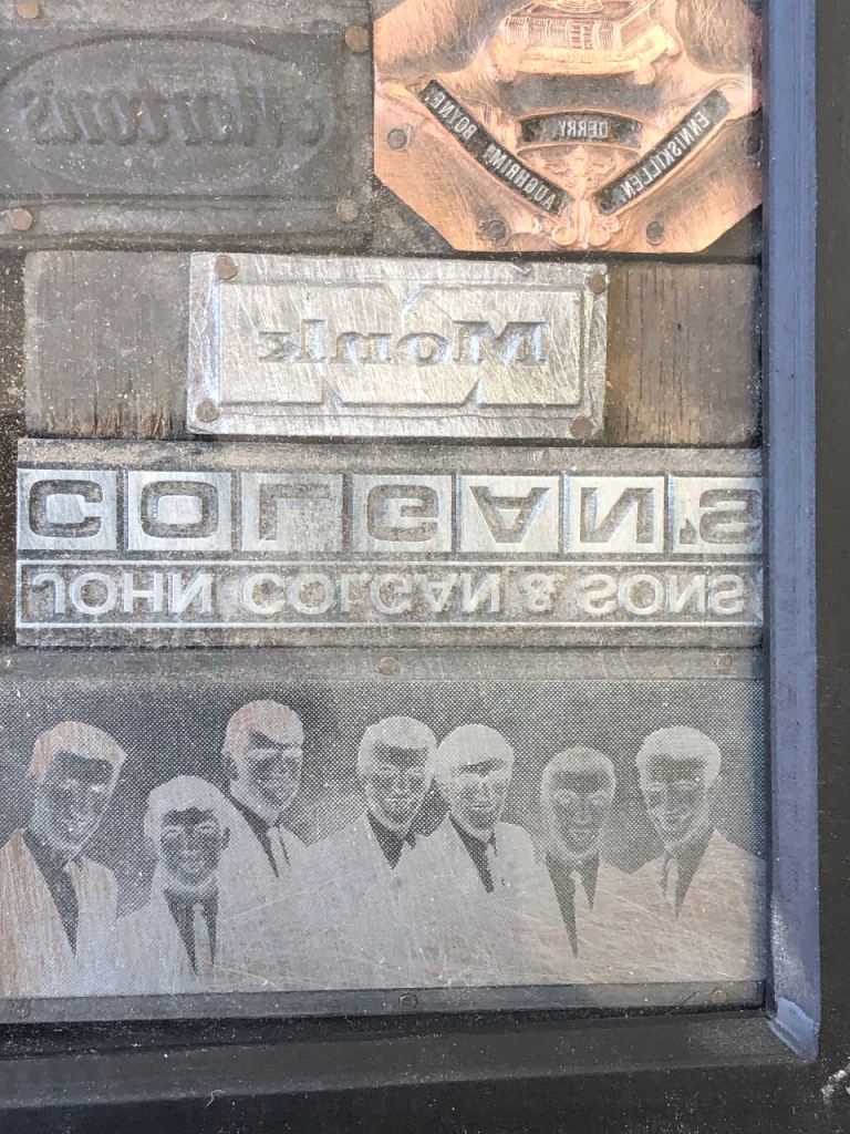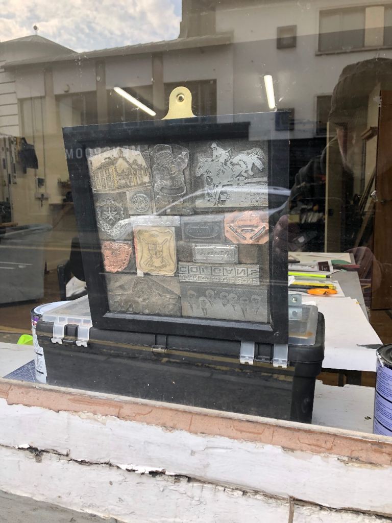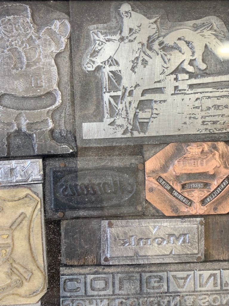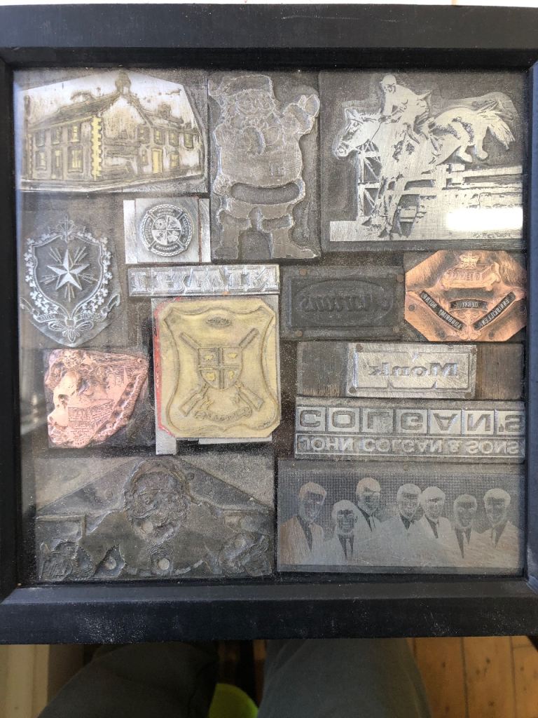Printers plates metal and copper from years gone by. These are one off printers plates in a box to hang they are very heavy there is only one of these. Selling for a men’s shed charity £100 can contact me