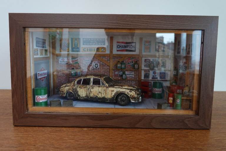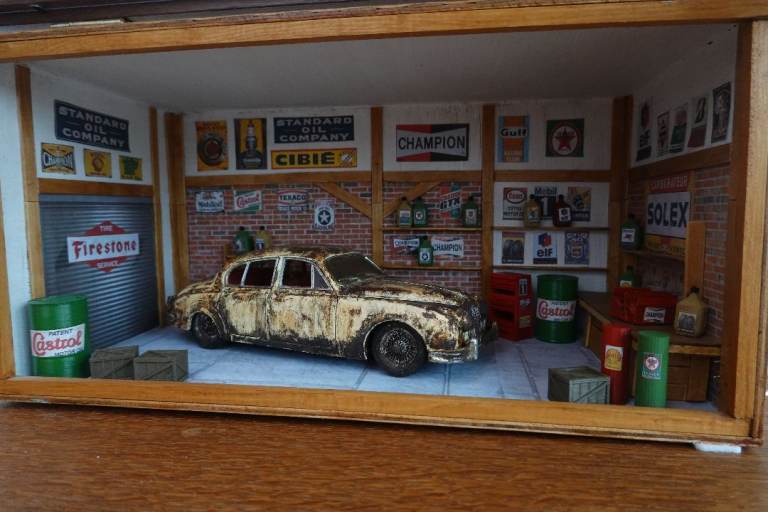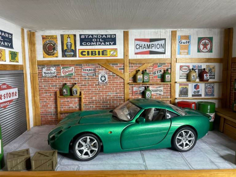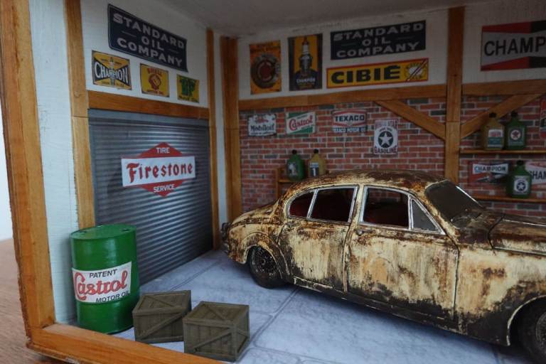 Hand-made diorama of a garage in approx. 1:18 scale