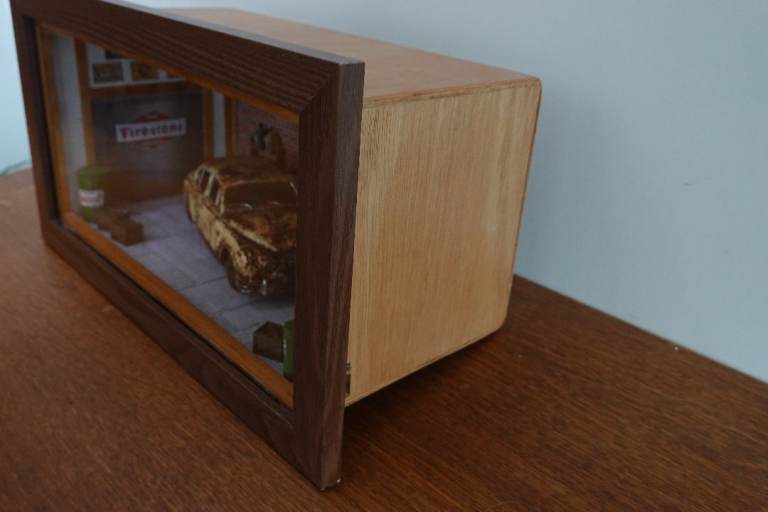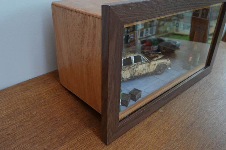 In wooden box with top hinged front and perspex "glass". Designed to be placed on a shelf, the front edge overhangs