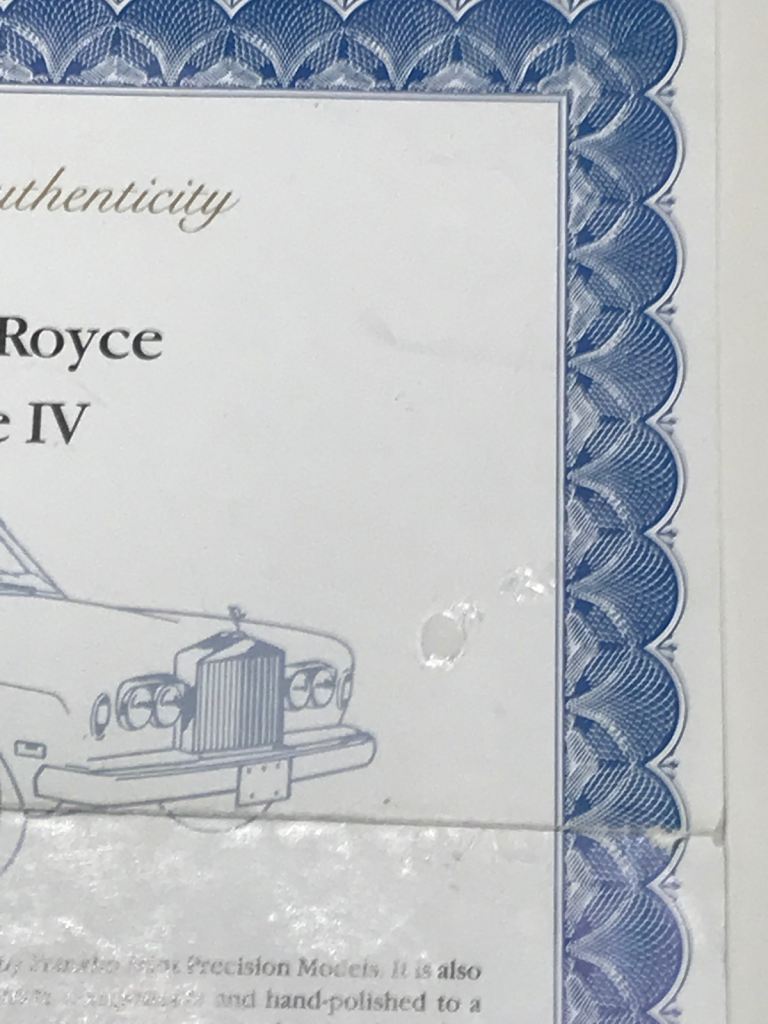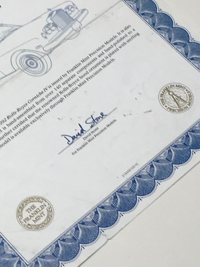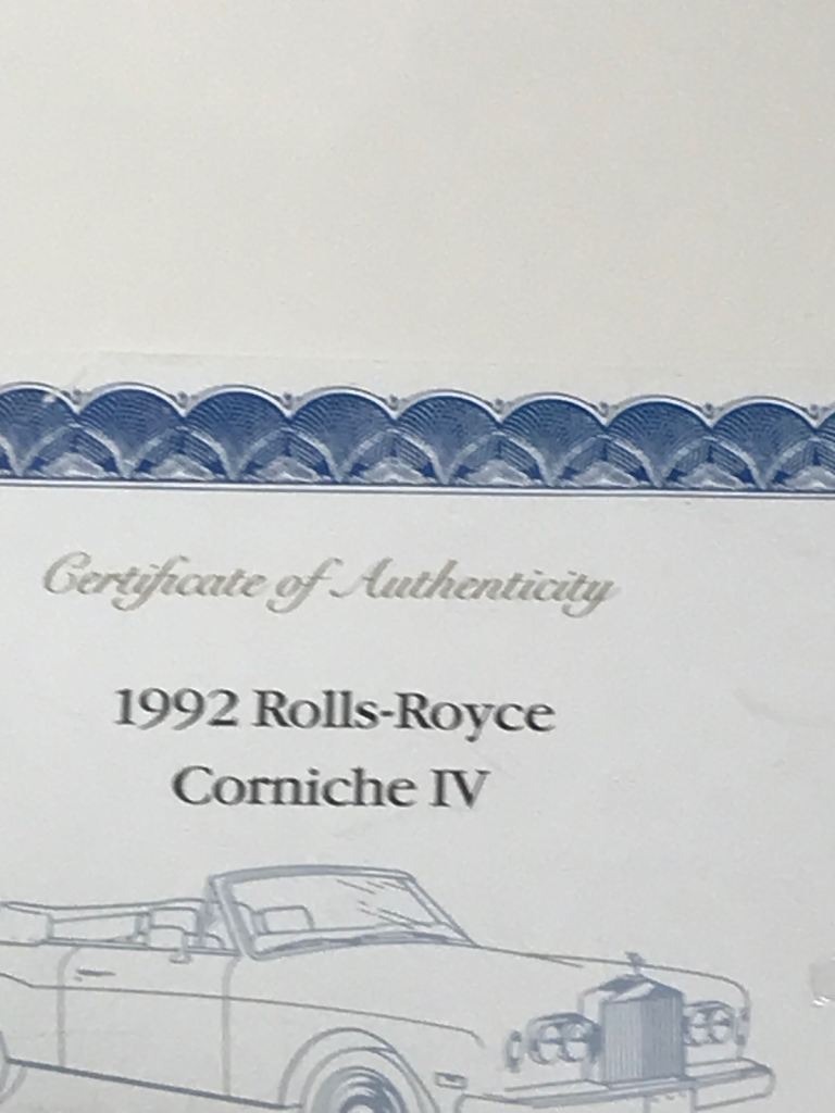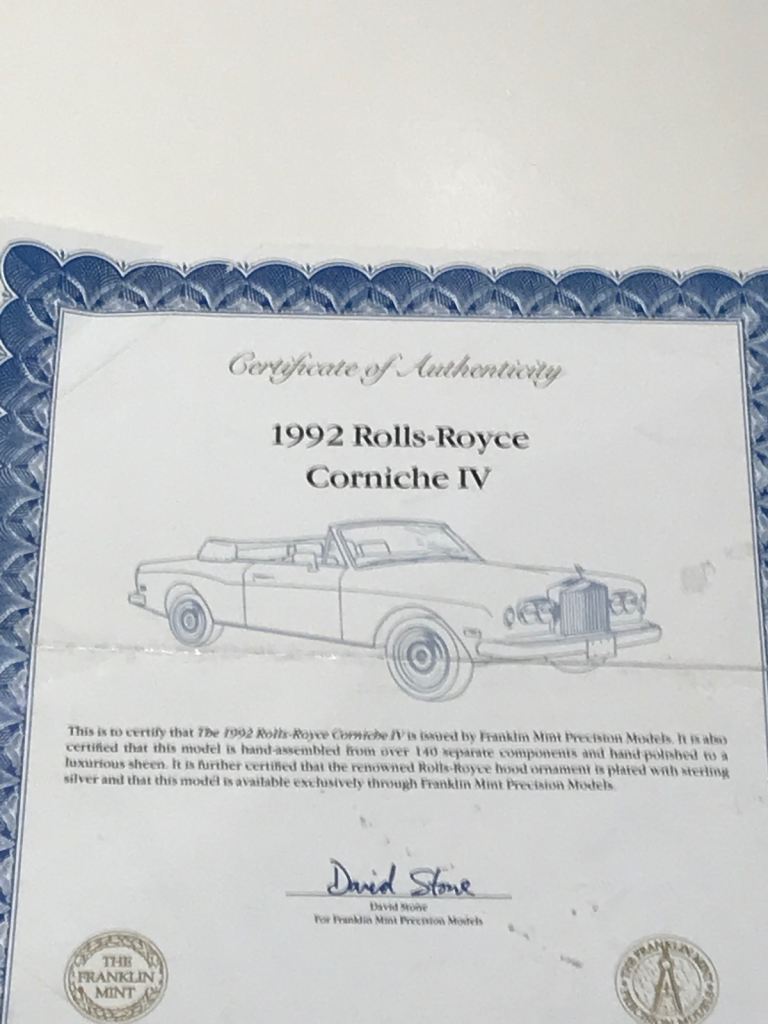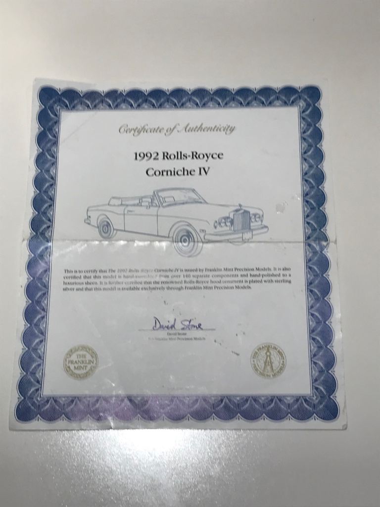 This is a Certificate of Authenticity from Franklin Mint for a 1/24 scale diecast model of a 1992 Rolls-Royce Corniche IV.