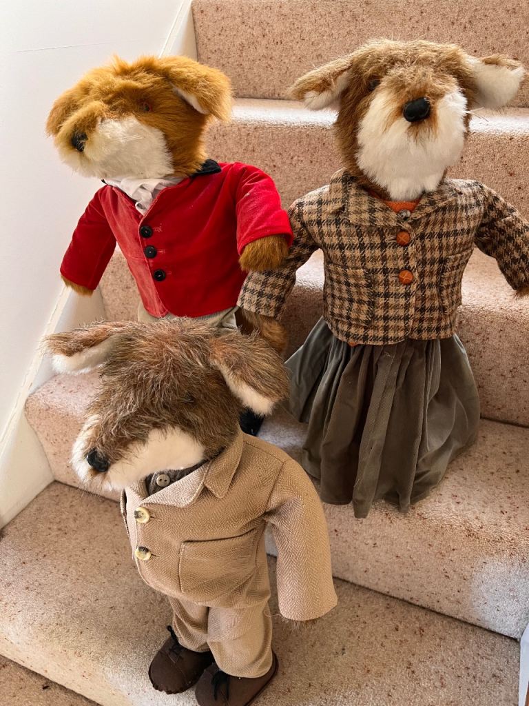 Collectable, handmade fox family for display. 20 inches/50 cms tall. Solid and each one unique. Beautifully dressed. Will sell individually if required but price reflects set of three.