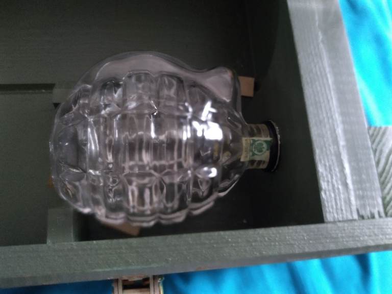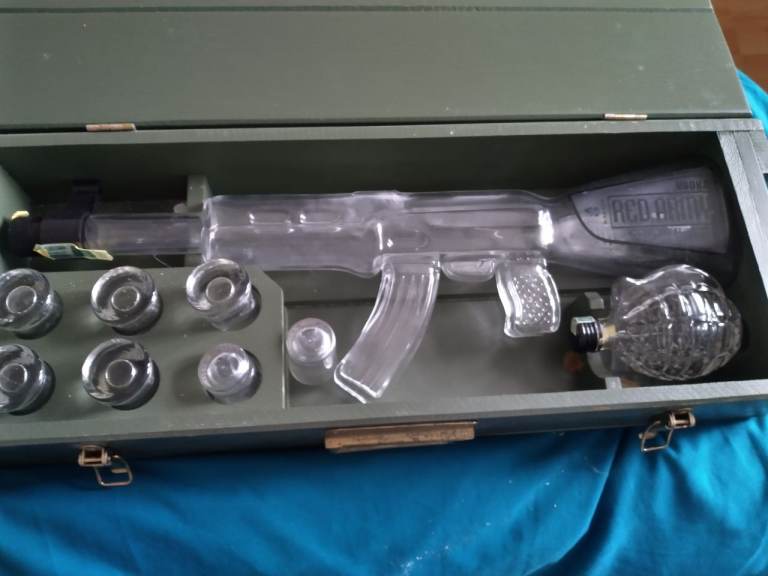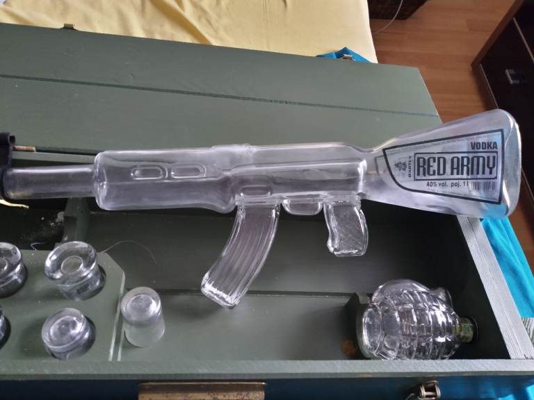 Ammunition box,ak-47 vodka bottle holds around 3/4 liters more or less proper size gun bottle.hand grenade decanter and shit glasses.
