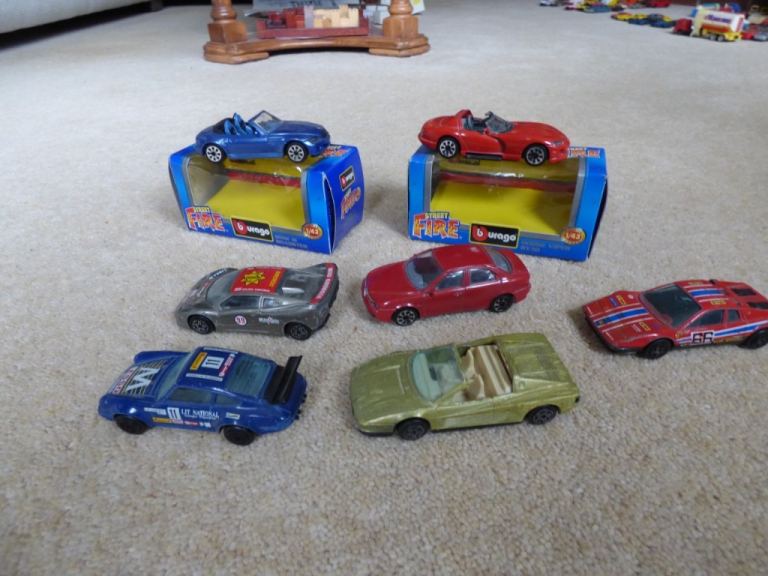 Collection of diecast model vans and cars by LLedo, Majorette, Matchbox, etc., wooden display case