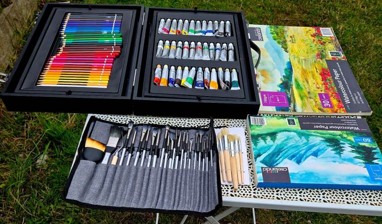 Elegant and sturdy wooden case includes: 36 bright watercolour, acrylic and oil paints, 130 high-quality multi-coloured pens, felt tip pens and oil pastels several brushes, pencils and other accessories.