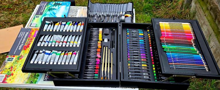 A large, comprehensive selection of paints and pencils, presented in a high-quality wooden case – the perfect gift for budding artists