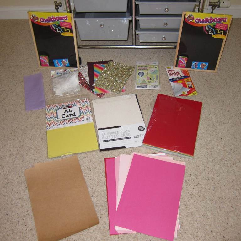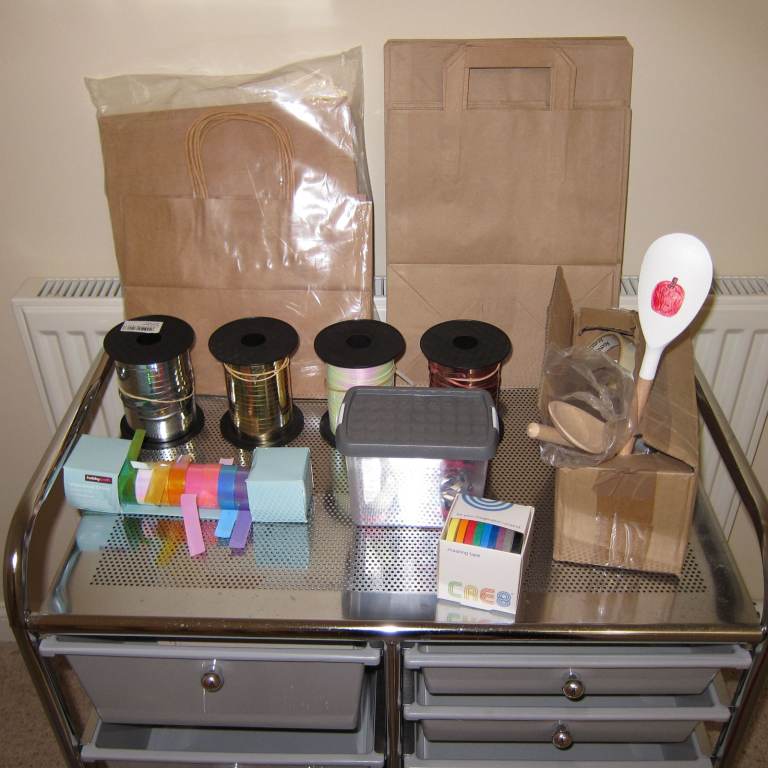 Craft items: ribbon in various colours. Coloured cards and paper bags. Tissue paper and cellophane for gift wrapping and creating gift presentation.