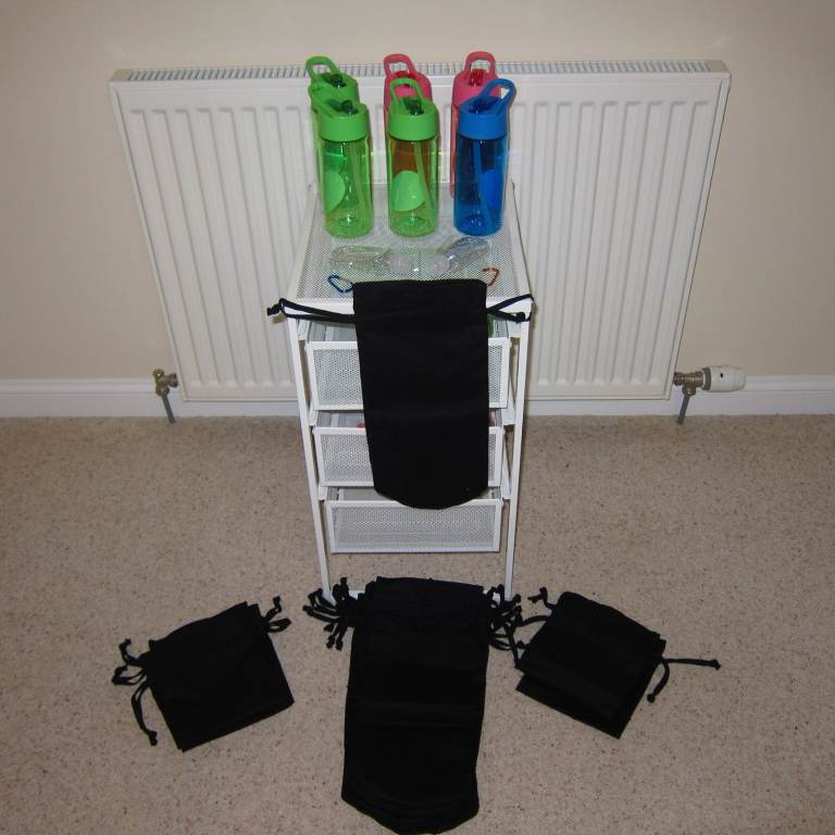 Various project items for personalisation. Water bottles(popular with school kids), hand sanitiser with carabiners(gaining in popularity due to flu?). Fabric bags for bottles, larger bags for gifts.