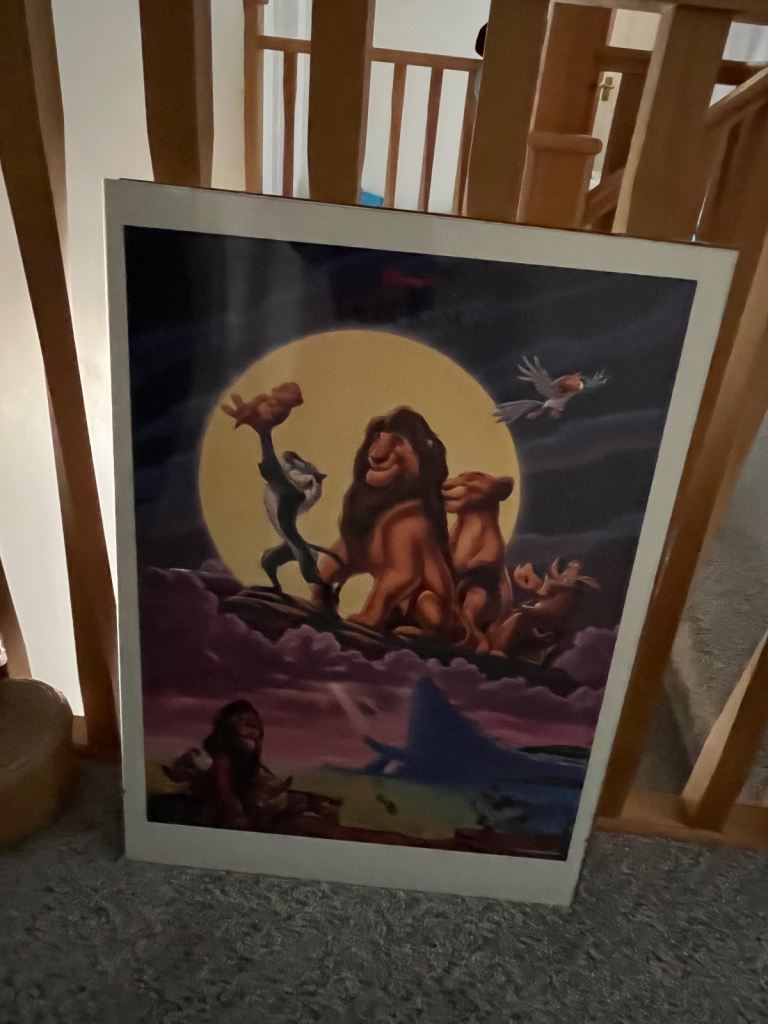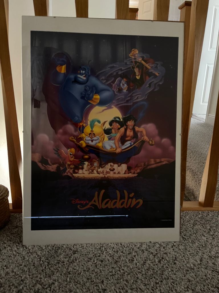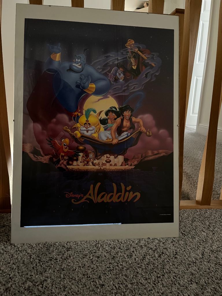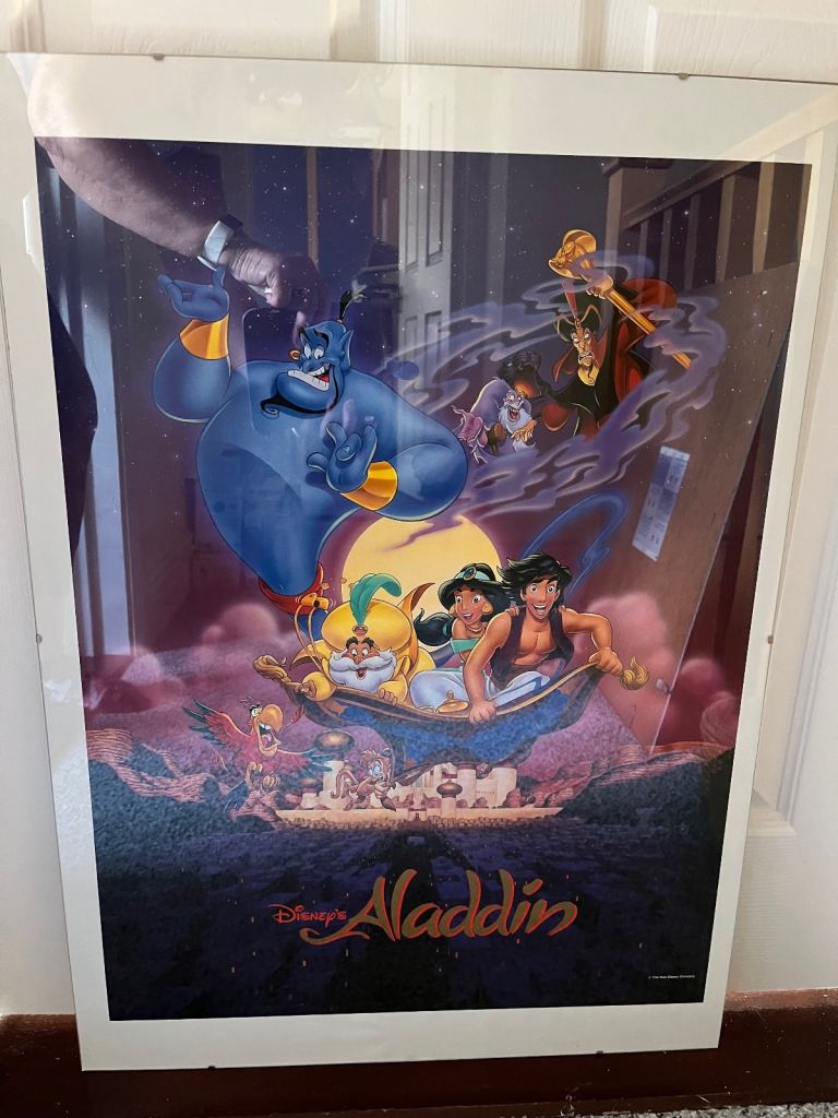 2 large Disney posters from 1990’s mounted in 70 x 50 cm clip frames. Excellent condition. The line across bottom of pictures is due to reflection, not actually on the poster. Spfh. On other sites. Collection Locks Heath. Each poster including clip frames £7