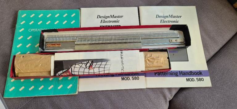 Knitmaster 580 Electronic Knitting Machine. Very good condition, only one owner from new. Standard gauge garter bar new, Knitmaster 560L lace carriage (needs servicing as not been in use for a long time) Silver Link cable for use with Designaknit software, Accessories and Manuals included. Machine Knitting Books. Machine knitting light.