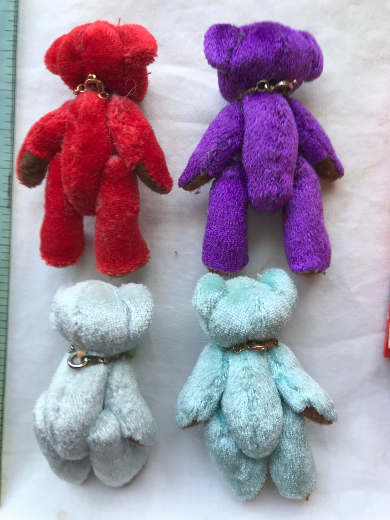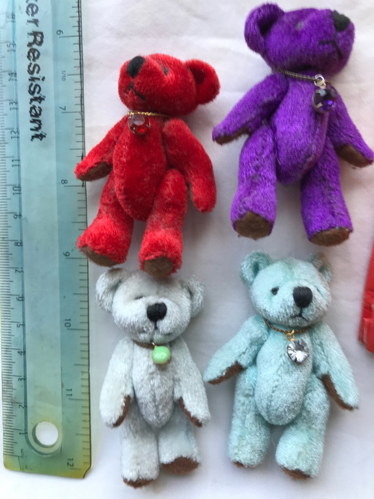 Each of the four coloured teddies wearing a necklace has movable arms and legs and are 7cm tall - £10 for all - Cash or Postal Order - Postage to be paid by buyer