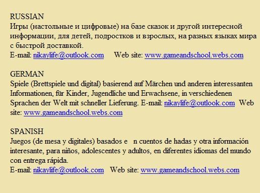 Learn foreign languages playing board games based on fairy tales and other interesting information: for children, teenagers and adults, in different languages of the world, fast delivery.