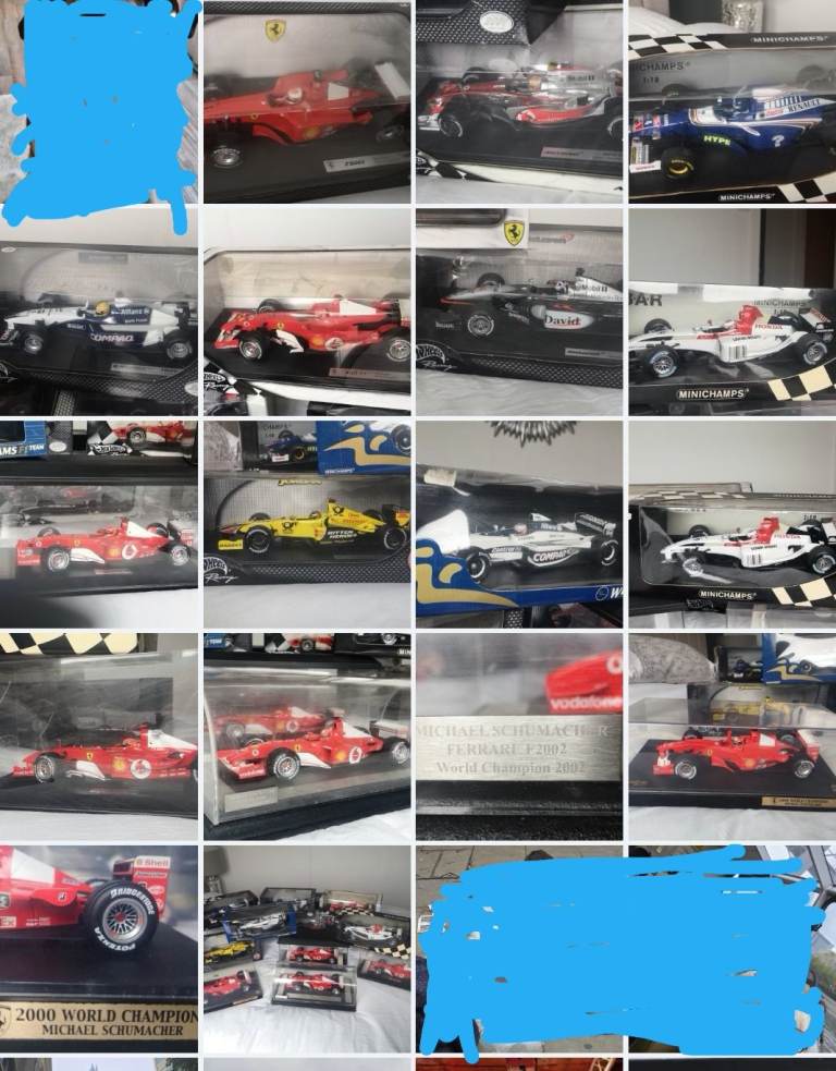 Lots of F1 cars. Still boxed, some are special editions. Some have hard plastic cases. Photos don't show them at their best so viewing is advised if interested. Most cost over £100, other cost more than £200. Only selling as one complete collection for £950 ideal for the Formula one fan.