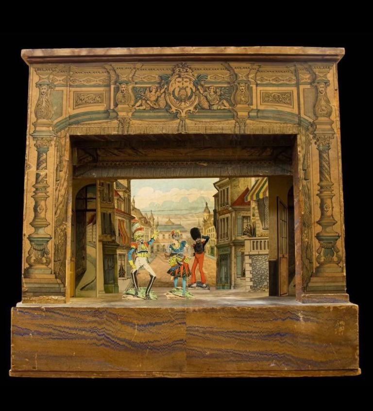 A French Proscenium toy theatre, 'Avant scene' by Pellerin, Epinal, France, circa 1880, mounted on a sturdy wooden frame with slotted stage to hold scenes and characters (scene is a town from the series 'Grand Theatre Nouveau') together with Pellerin/Epinal characters and a later set of Pied Piper figures. This came from the collection of the late Peter Baldwin who played Derek Wilton in Coronation Street.