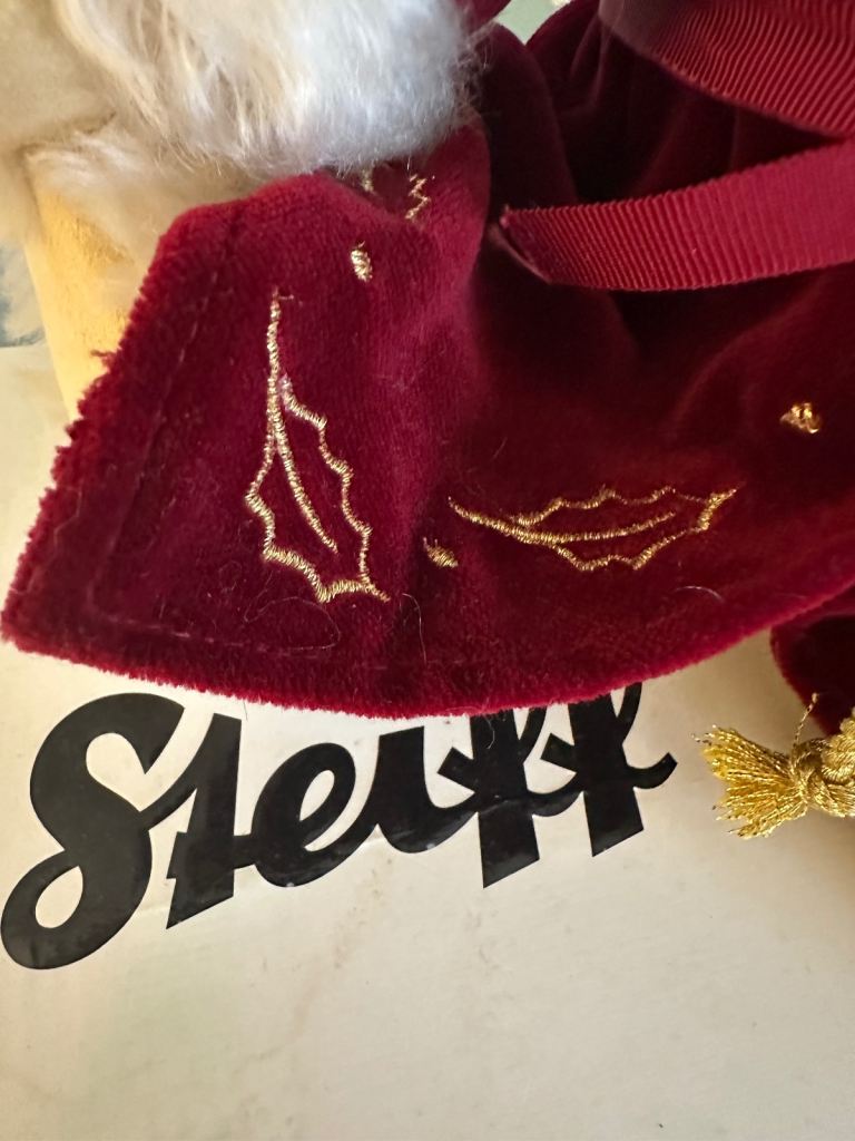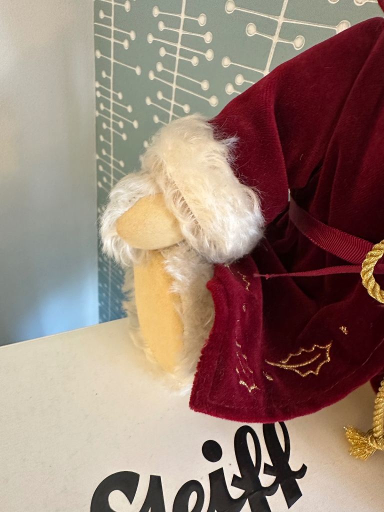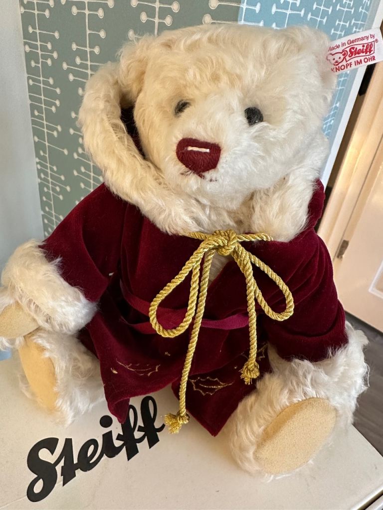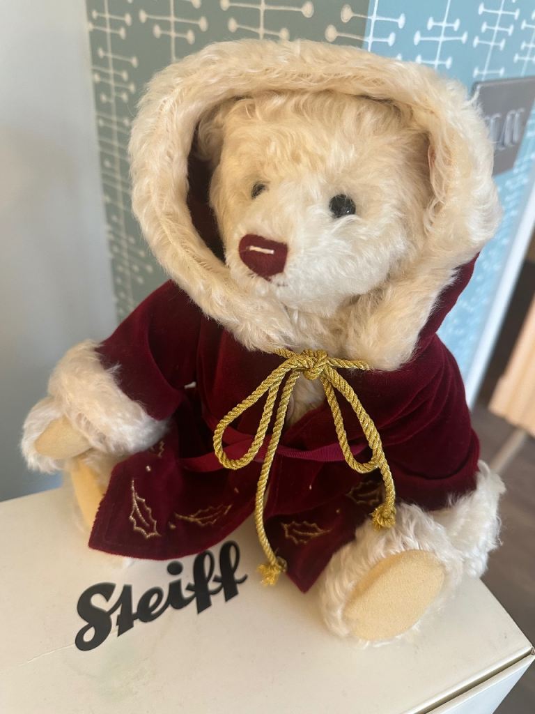 A genuine STEIFF 2005 Christmas bear in creamy white mohair, with gorgeous dark russet velvet embroidered hooded coat with white fur trim to hood and cuffs. Has white ear tag and jointed body.
