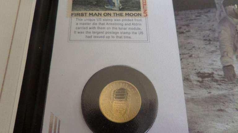 Issued to commemorate the 50th anniversary of the moon landing this half eagle gold proof coin is of a dished ( concave/convex) design. One side depicts the first footprint on the moon and the other side is the astronauts view. This is a limited edition proof and in this format by Harrington & Byrne it is one of only fifty produced. It is 21.6 carat and weighs 8.35 grams. A little more than a sovereign. Highly collectable proof American half eagle coin. No post - collection only thanks. Gorton, Manchester M18 7NS.