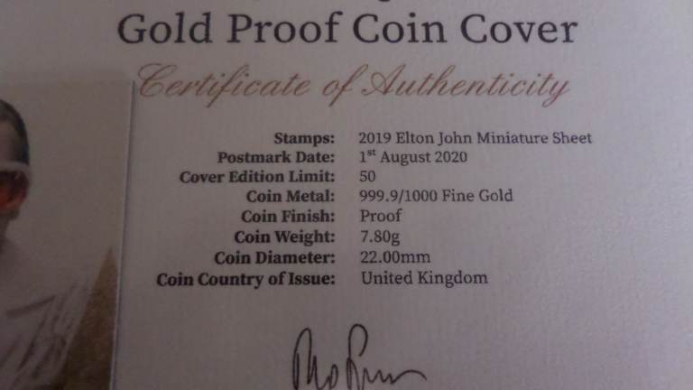 Royal Mint ELTON JOHN MUSIC LEGENDS SERIES. Produced by Harrington & Byrne as a 2020 Quarter Ounce Gold Proof Coin Cover. Limited edition of only 50. 999.9 fine gold. 7.8grams. Extremely rare item. Superb investment for yourself or what a gift for an Elton fan. You will probably never see another. No postage. Collect only Gorton, Manchester M18 7NS.