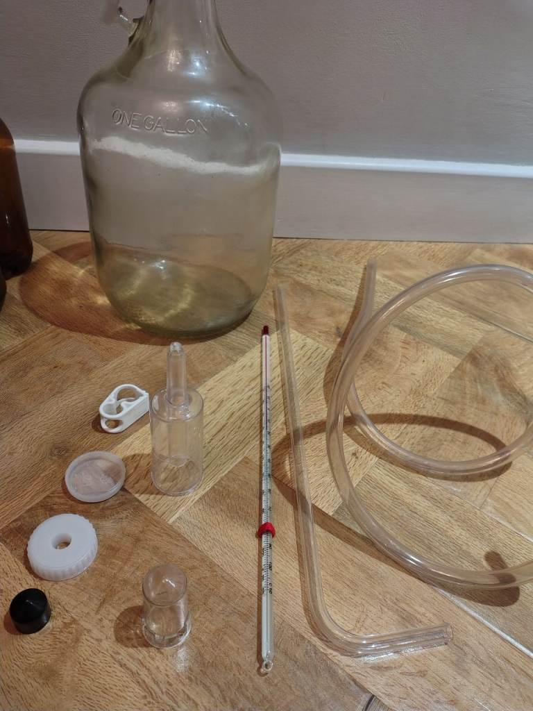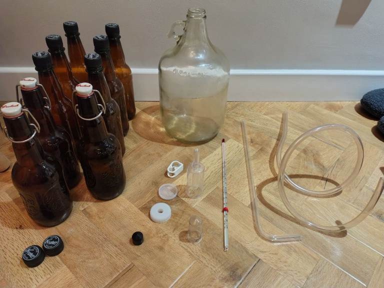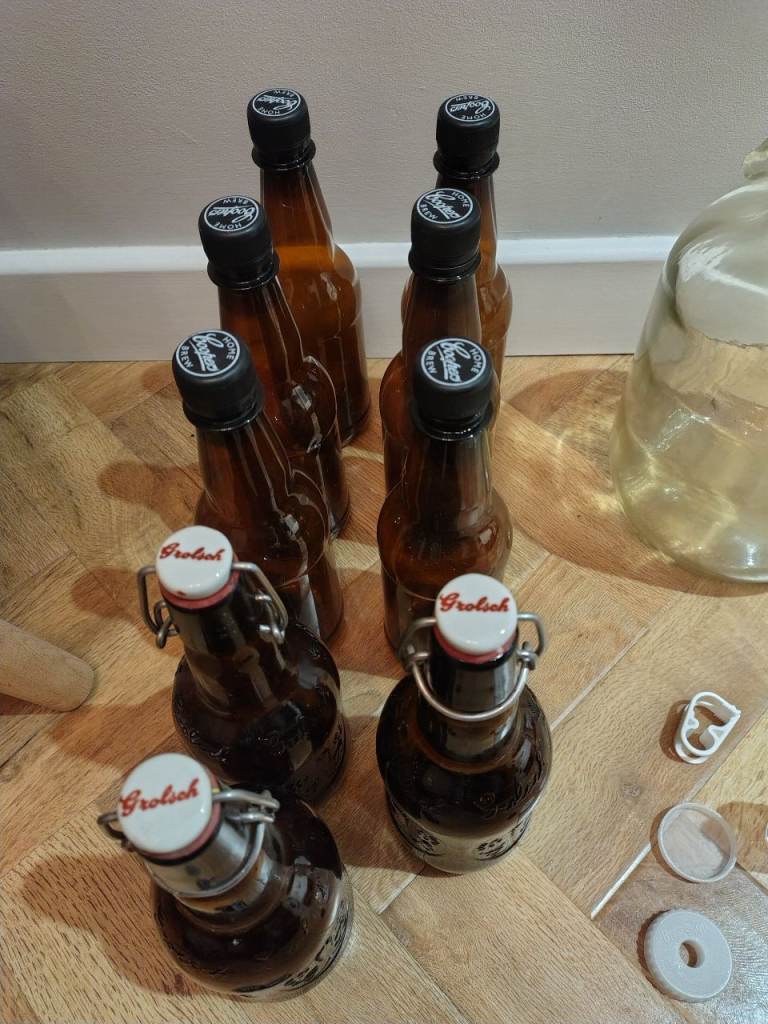 Home brew accessories with 3 glass grolsch bottles and 6 plastic bottles.