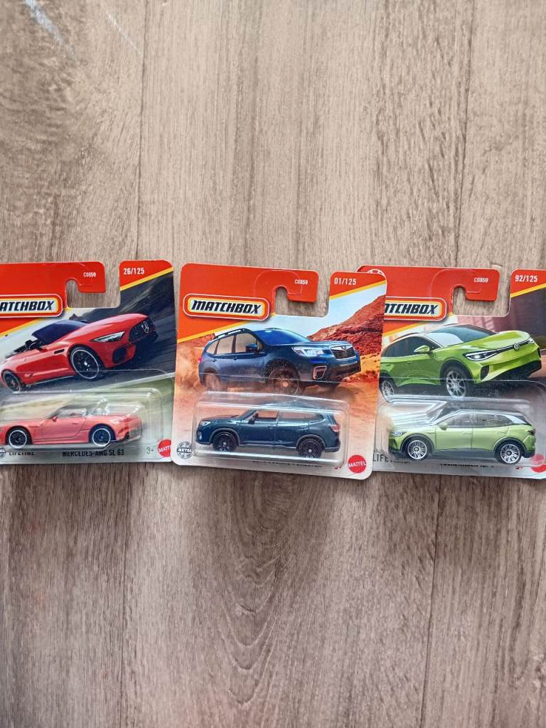3 matchbox cars and three hot wheels cars with slightly damaged boxes