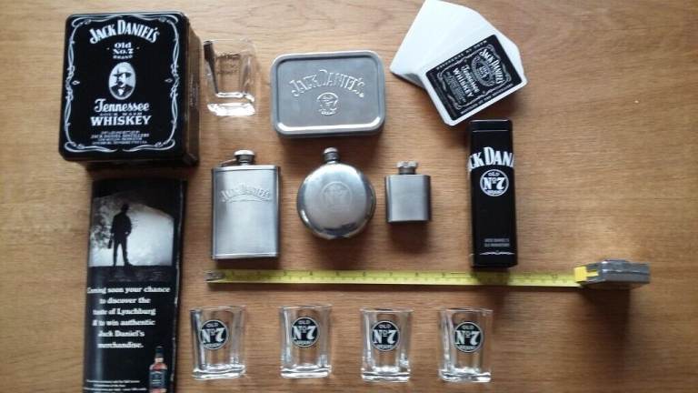 2 metal containers (empty),1 leaflet,5 shot glasses,1 card game & tin, 3 hip flasks