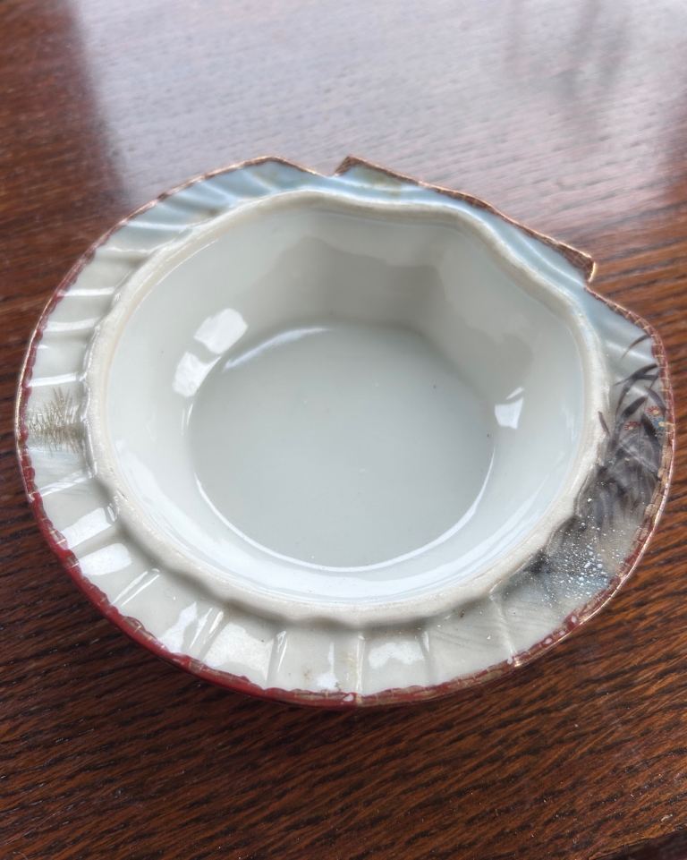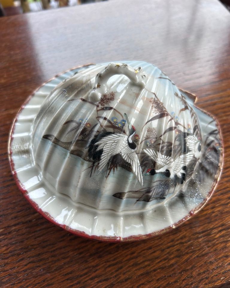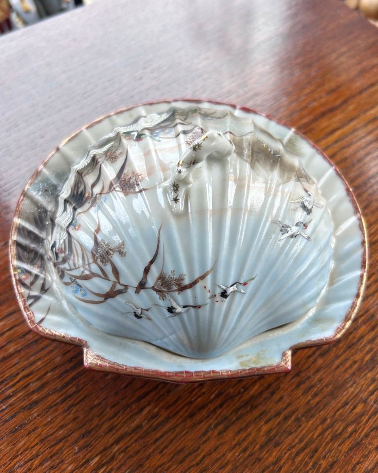 This Japanese porcelain clam shell trinket dish measures 15.5cm across and features cranes flying and at a pond.