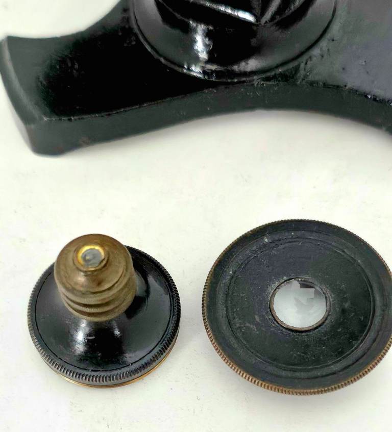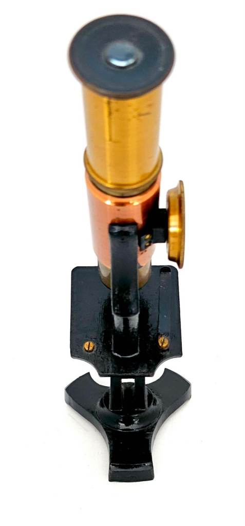 On offer is a late 19th century French student Microscope (as per the same model in the London science museum) with a horseshoe base and a side focusing wheel.