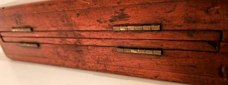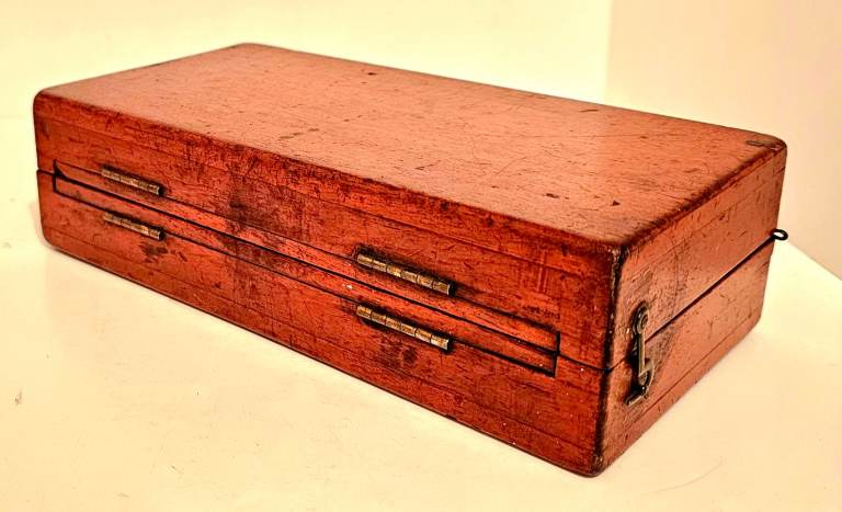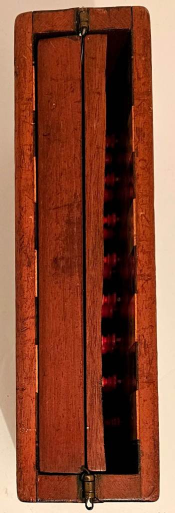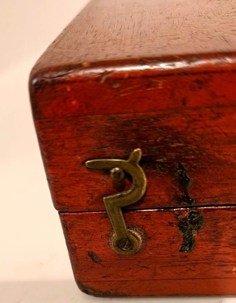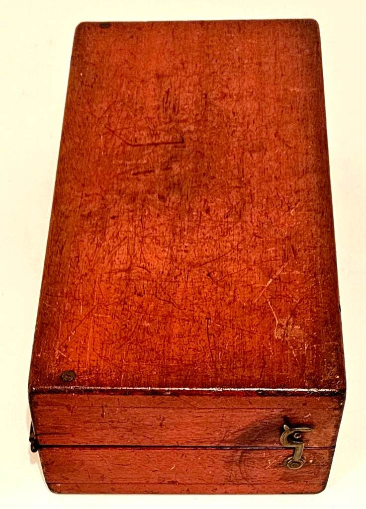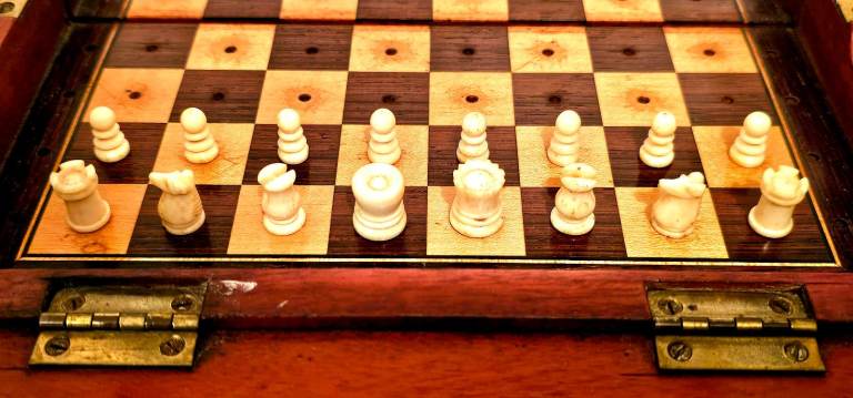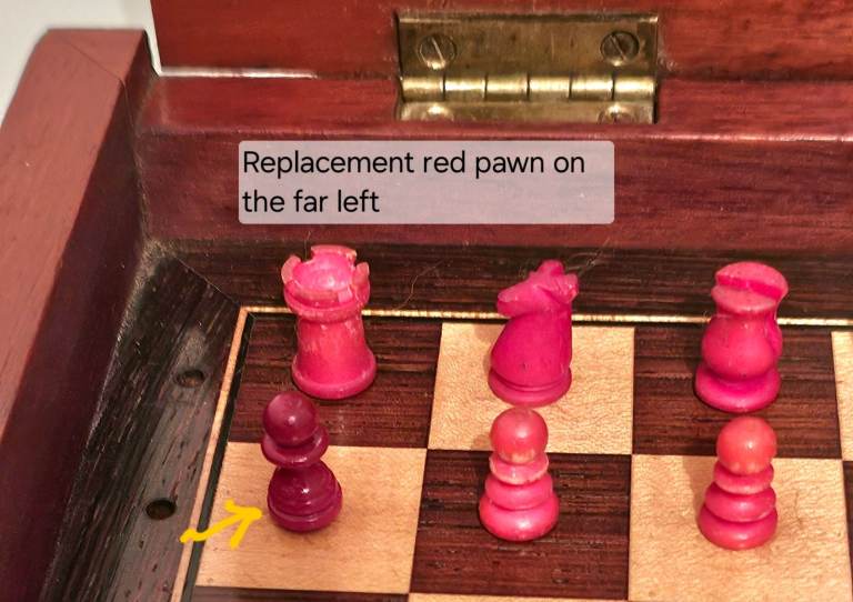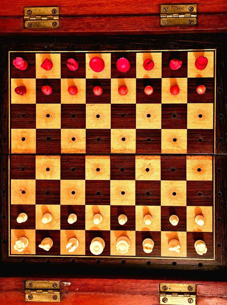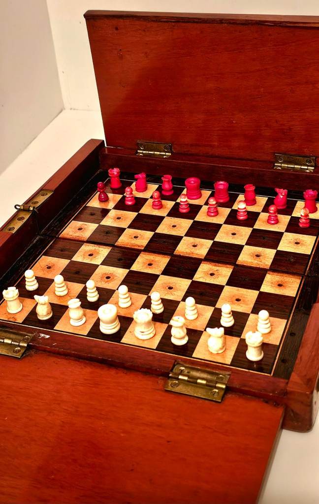 On offer is a nice late Victorian travelling mahogany chess set with rose wood and satin inlay board (Whittington pattern). Please note: 1 red pawn is a donor piece and part of the flap lip on one lid has some loss. The pieces all remain in place when travelling. The board size to the outside edges are 10 inches x 10 inches. The king is 1.5 cm high not including the stem. The chessmen are bone with the usual random flecks, except the donor pawn which is wood.