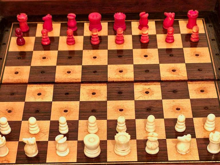 Late Victorian travelling mahogany chess set with rose wood and satin inlay board (Whittington pat).