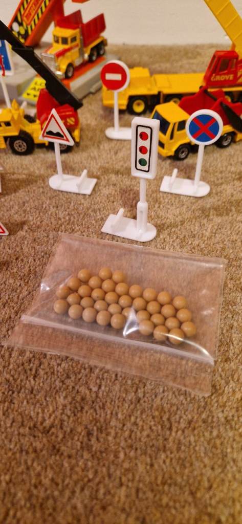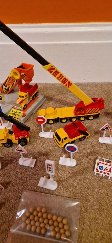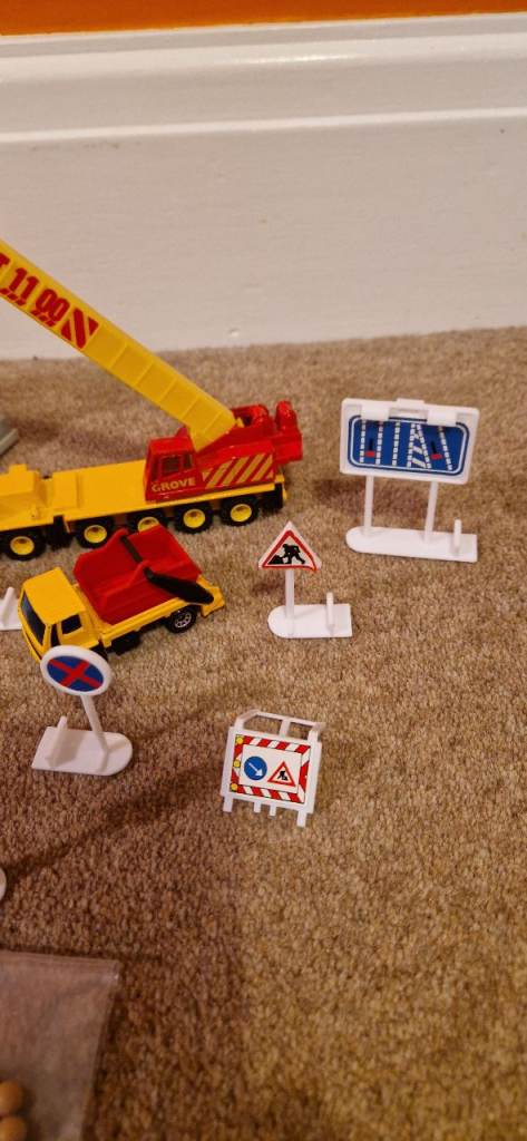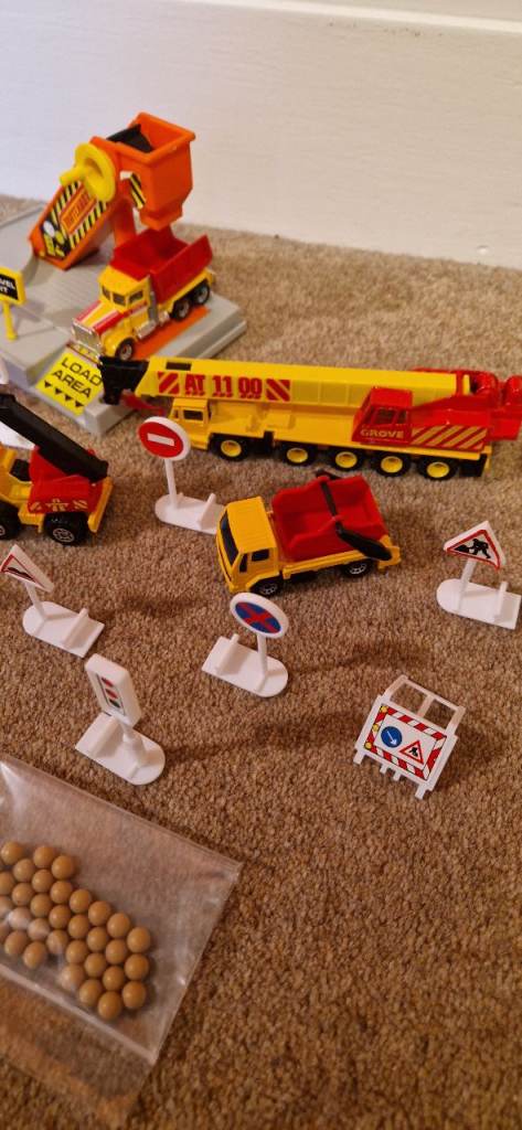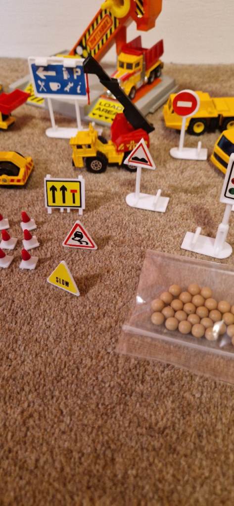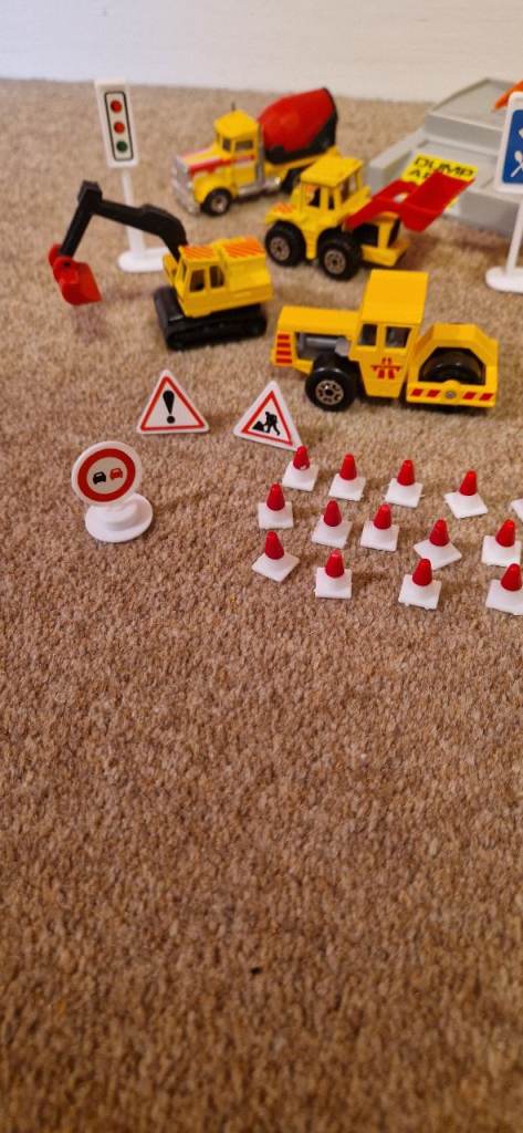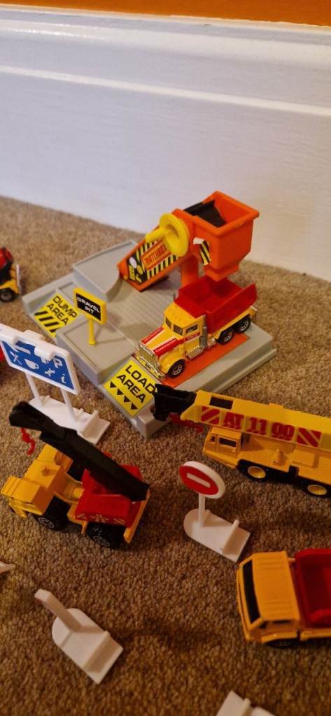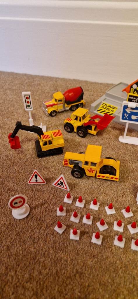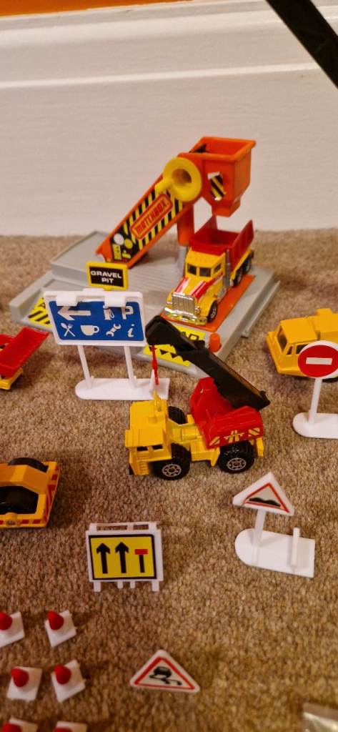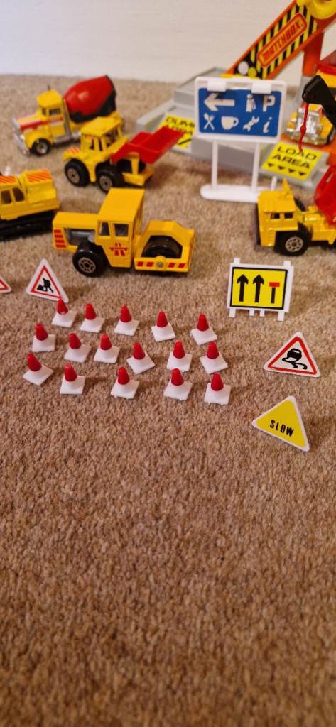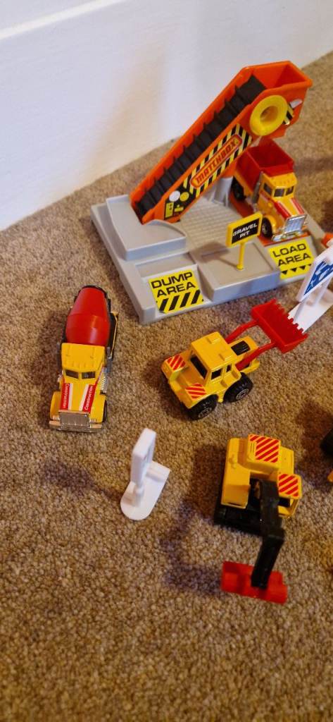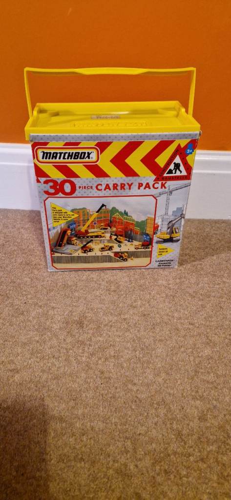 Please study the photos carefully to fully appreciate the "like new" condition of this toy from 1992. This is the MATCHBOX CS 90 Construction Toy in a 30 Piece Carry Pack. You will notice in the photos there is a handle that stands up to carry this set. It states on the box "This Carry pack is designed with extra space to carry and store your Matchbox Vehicles & accessories!" The carrying case is in excellent condition. I have examined this toy thoroughly and the only pieces I can see missing are the scaffolding and two tiny ladders. The vehicles include a Bulldozer, a Faun Crane, a Grove Crane, a Dump Truck, a Cement Mixer, a Road Roller, a Backhoe, and a Skip Gravel Truck. This was VERY GENTLY used as the 8 construction die cast metal vehicles look new. There is a loading dock with a conveyer that delivers small boulders to the trucks along with lots of signs and traffic cones etc.